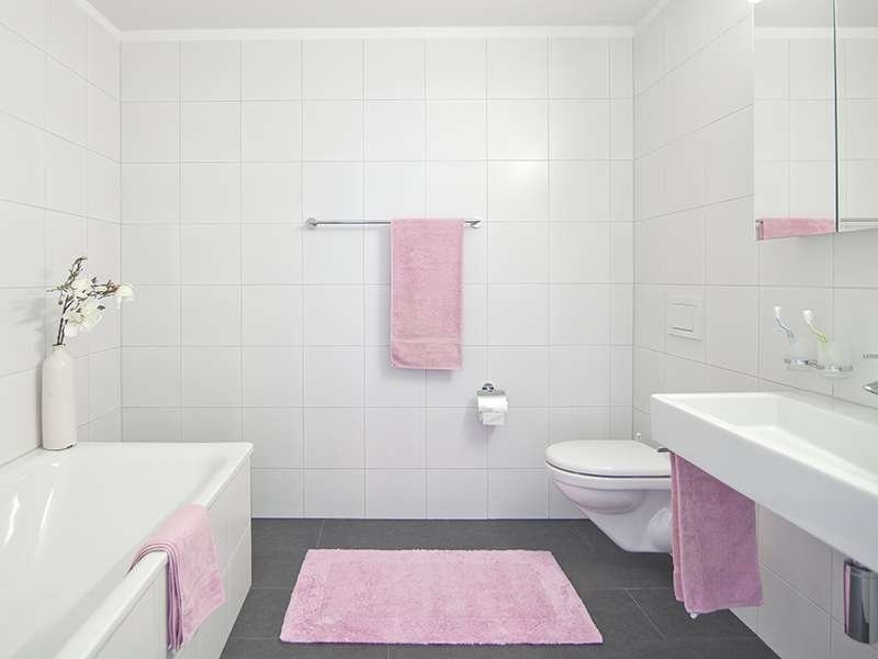 - In der Nasszelle sind mit dunklen Bodenplatten und raumhoch verlegten weissen Wandplatten ausgestattet