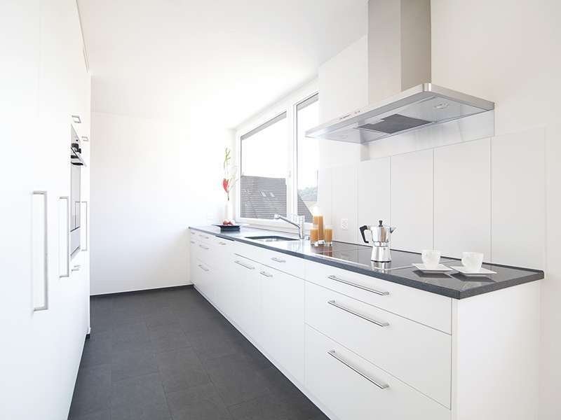 - In der Küche schaffen keramische Bodenplatten, helle Fronten und die Natursteinabdeckung einen stilvollen Touch