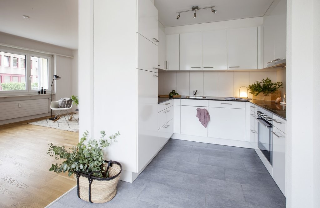 - Küche und Nasszelle mit pflegeleichtem, dunklem Plattenboden