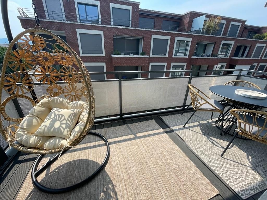 Der grosszügige Balkon ist der ideale Ort, um den Tag mit einem Kaffee in der Morgensonne zu beginnen oder den Abend bei einem Glas Wein ausklingen zu lassen.