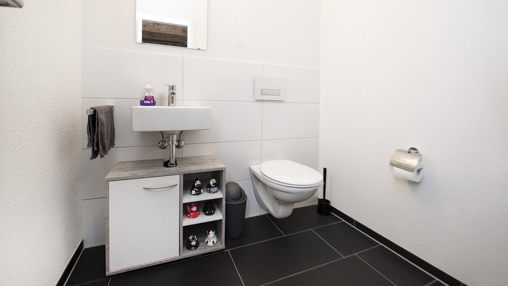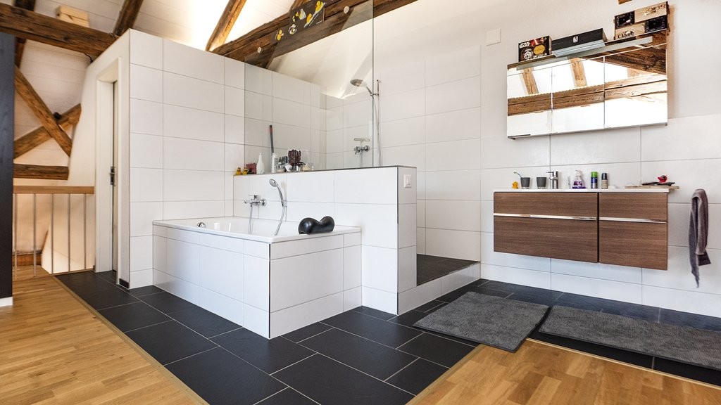 - offenes und modernes Badezimmer mit schwarzen Bodenplatten