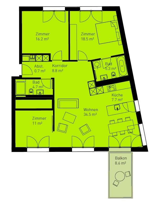 - Parkett- und Plattenboden - Offene Küche mit Essecke - Badezimmer mit Badewanne - Dusche/WC - Waschmaschine + Tumbler in Wohnung - Grosser moderner Balkon - Kellerabteil