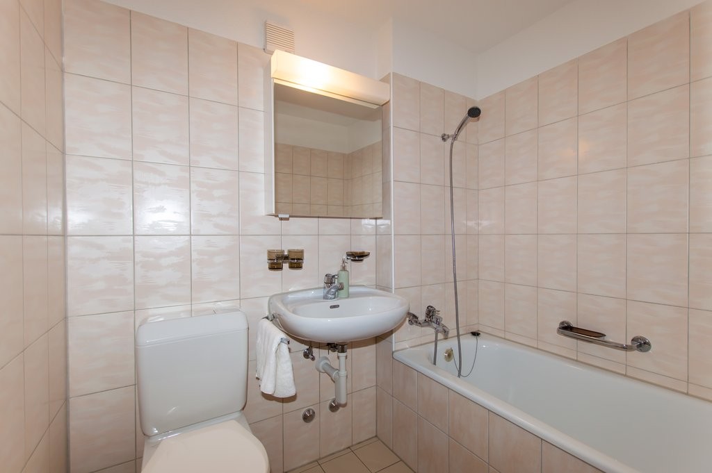 - Badezimmer mit WC, Lavabo, Spiegelschrank und Badewanne