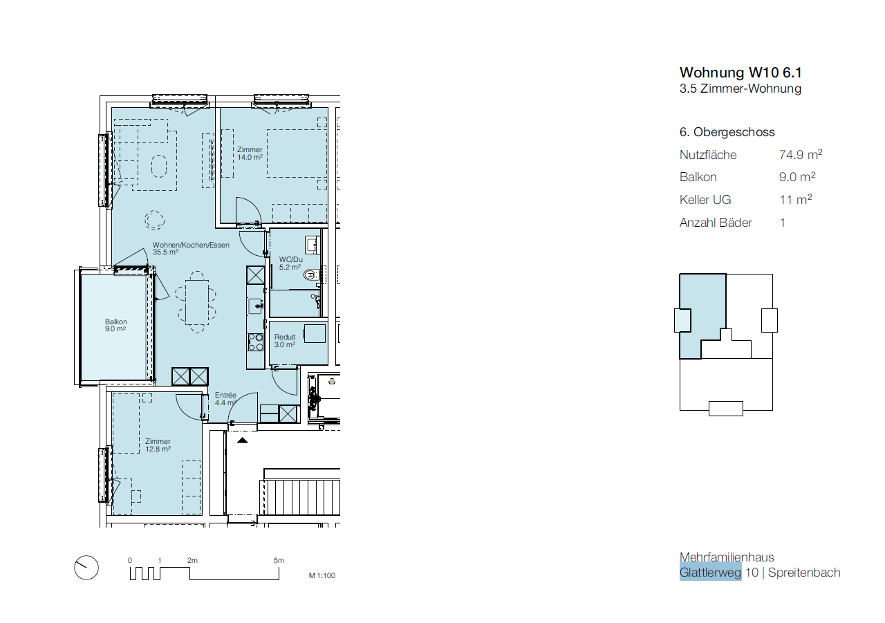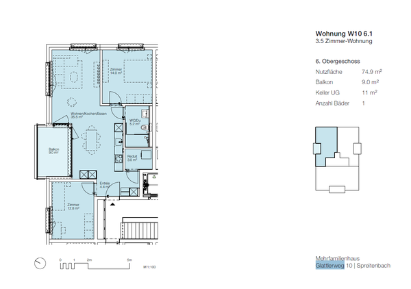 Die Wohnung befindet sich im Areal Glattlerpark, an der südlichen Ecke des Quartiers Langäcker. Auf dem Areal sind diverse Einkaufsmöglichkeiten und Restaurants vorgesehen. Ihre Kinder profitieren von einem Schulweg von weniger als zwei Minuten, wie auch zum Kindergarten Spreitenbach. Der Anschluss an die öffentlichen Verkehrsmittel sind in nur drei Minuten erreichbar. Die Stadt Zürich ist über die Autobahn, die Limmattalbahn sowie die S-Bahn unkompliziert erreichbar.