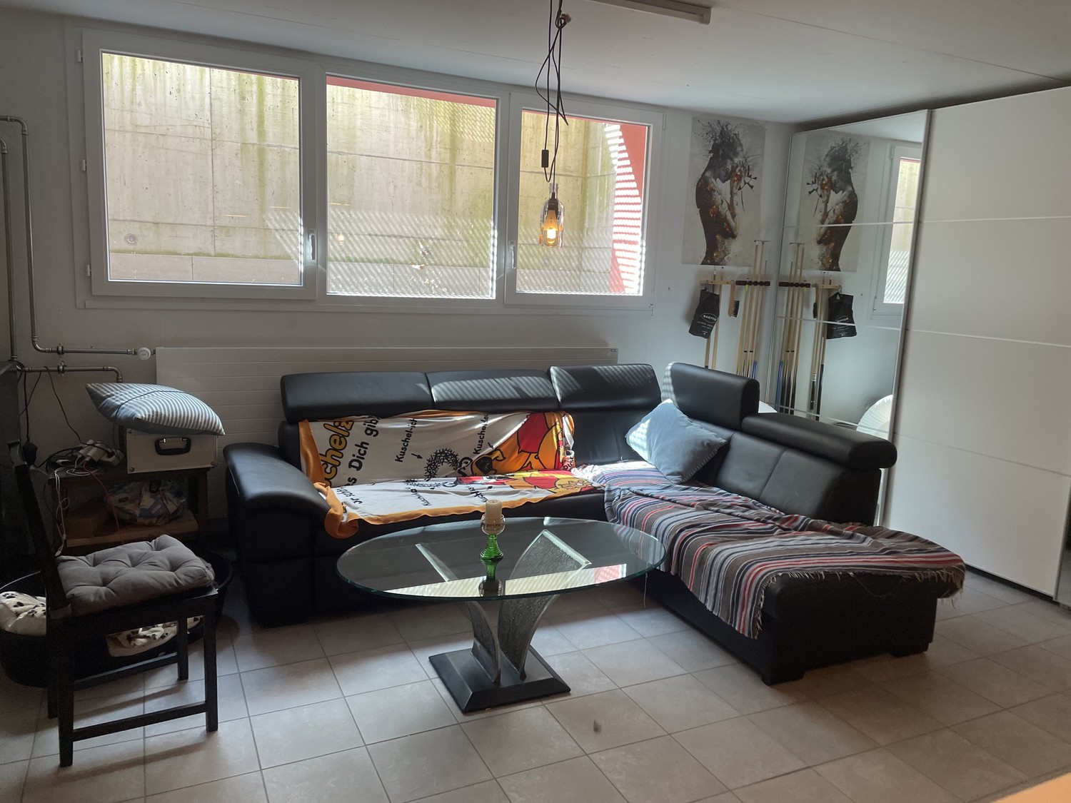 Das Zimmer ist hell und gross in schönem grossen Haus (250 m, 150 m davon Gemeinschaftsfläche). Wir haben das ganze Haus für uns. Es steht sehr viel Platz inkl Aussenterasse und Bar/Billiard zur Verfügung. Wir sind eine lebendige 5er Wg, bestehend aus Kai (Betreuer), Jean-Marie (zieht aus aufgrund der Liebe), Björn (IT), Christian (Koch) und Laura (Hotelerie). Alle stehen fest im Leben und mögens gerne gesellig, ist keine Zweck-WG.