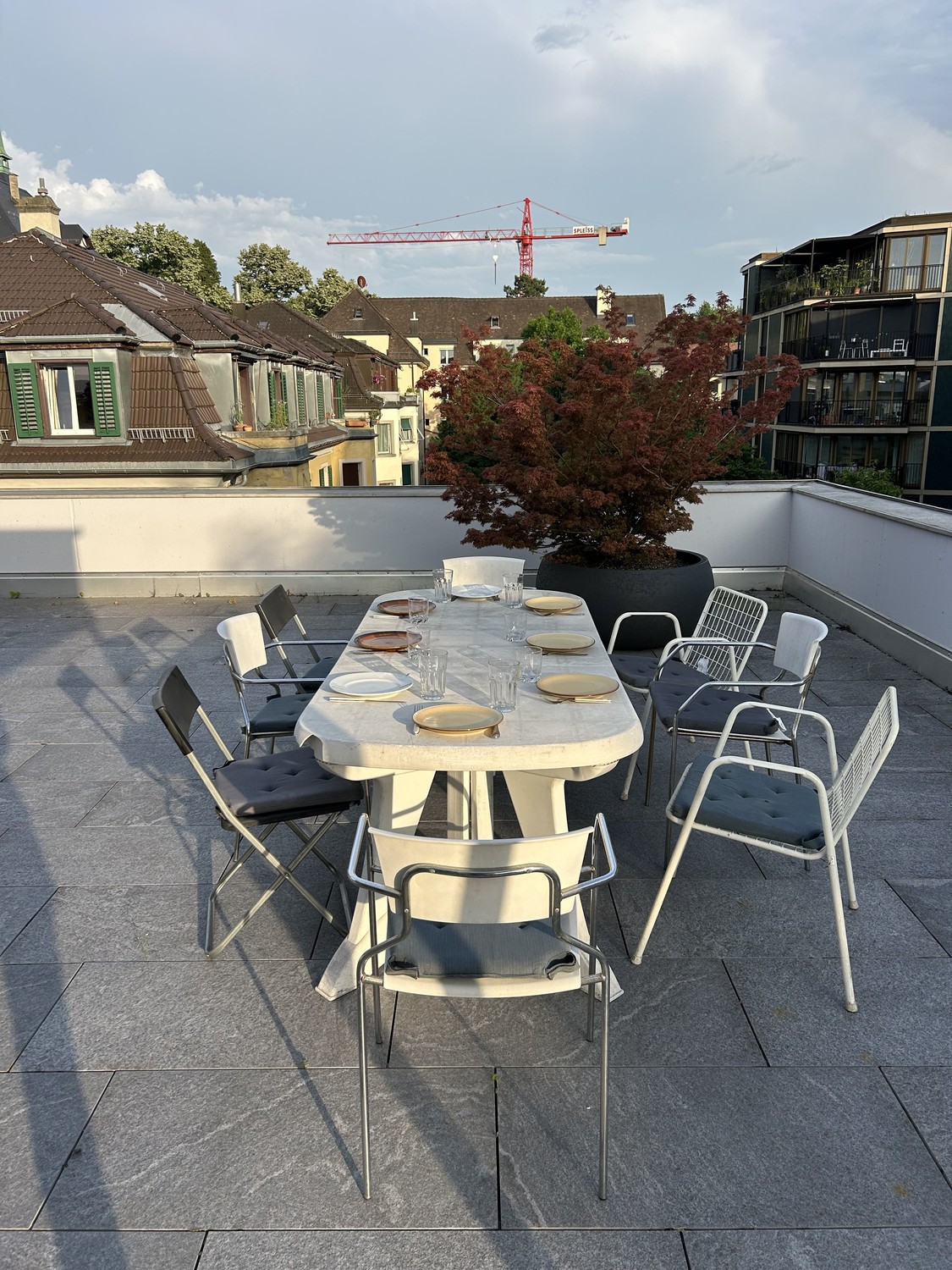 The flat is pure magic: 160 m2 of light and space, large windows with views on Zurichberg, and a private rooftop with a veggie garden, berries, BBQ, and enough space for sunsets, friends, and possibly a sauna or ping-pong table (the debate is still open).