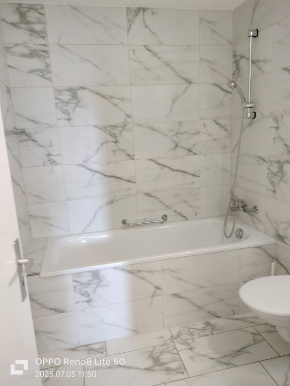 Modernes Badezimmer: Mit Marmorfliesen, Badewanne, WC und Waschbecken ausgestattet.