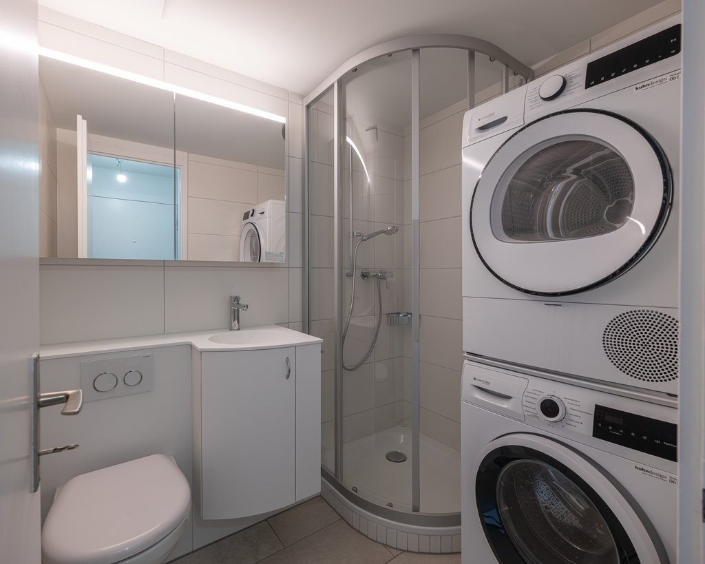 Dusche / WC mit originellem Waschtischmöbel und eigenem Waschturm für maximale Flexibilität beim Waschen.