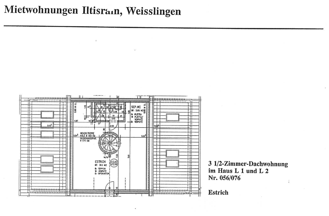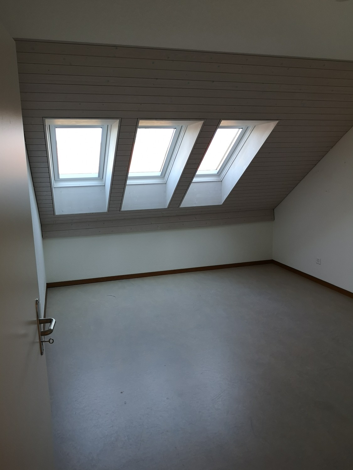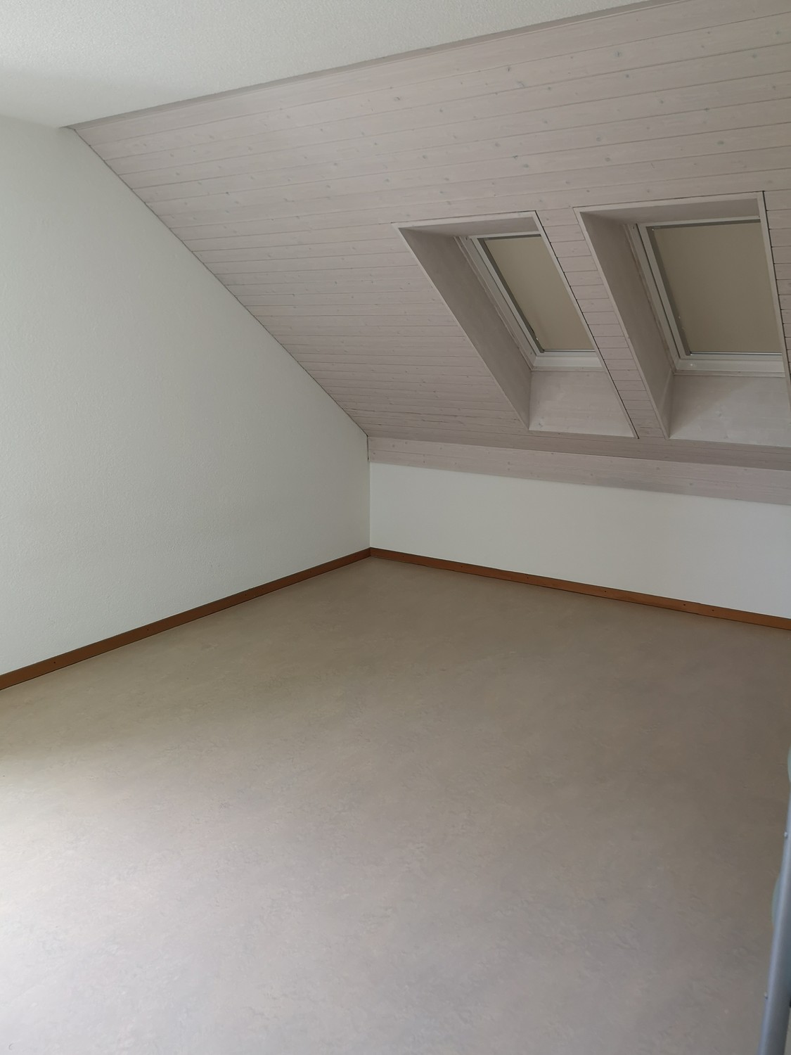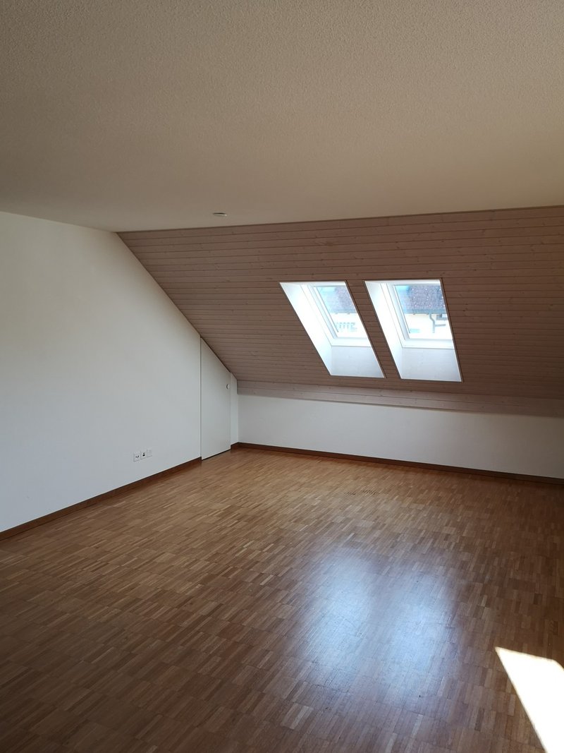 Die Wohnung im Dachgeschoss ist gut isoliert und mit modernen Fenstern ausgestattet. Der 39 m^2 Estrich bietet zusätzlichen Wohnraum und ein Badezimmer, weshalb die Wohnung vom Platzangebot her eher einer 4.5 Zimmer Wohnung entspricht.