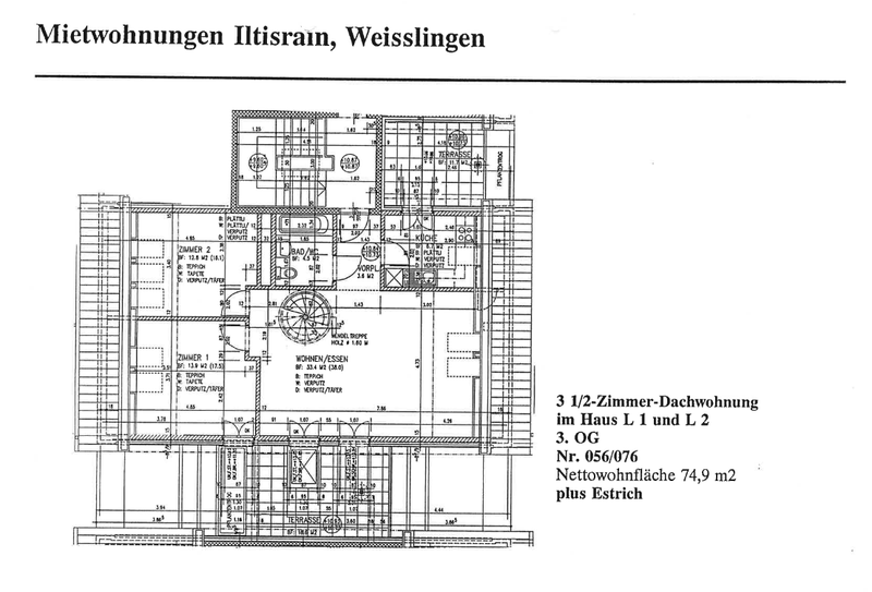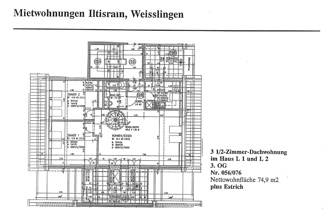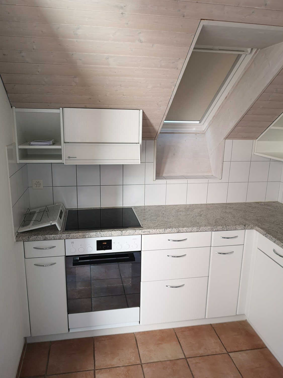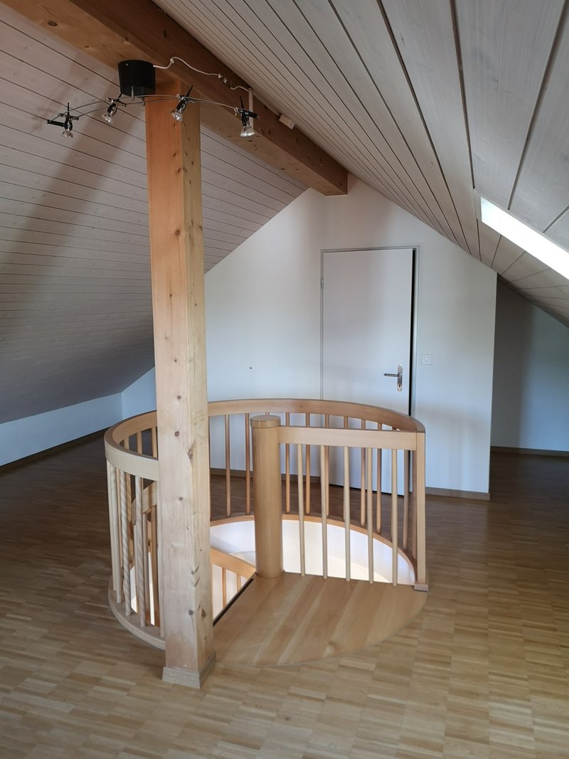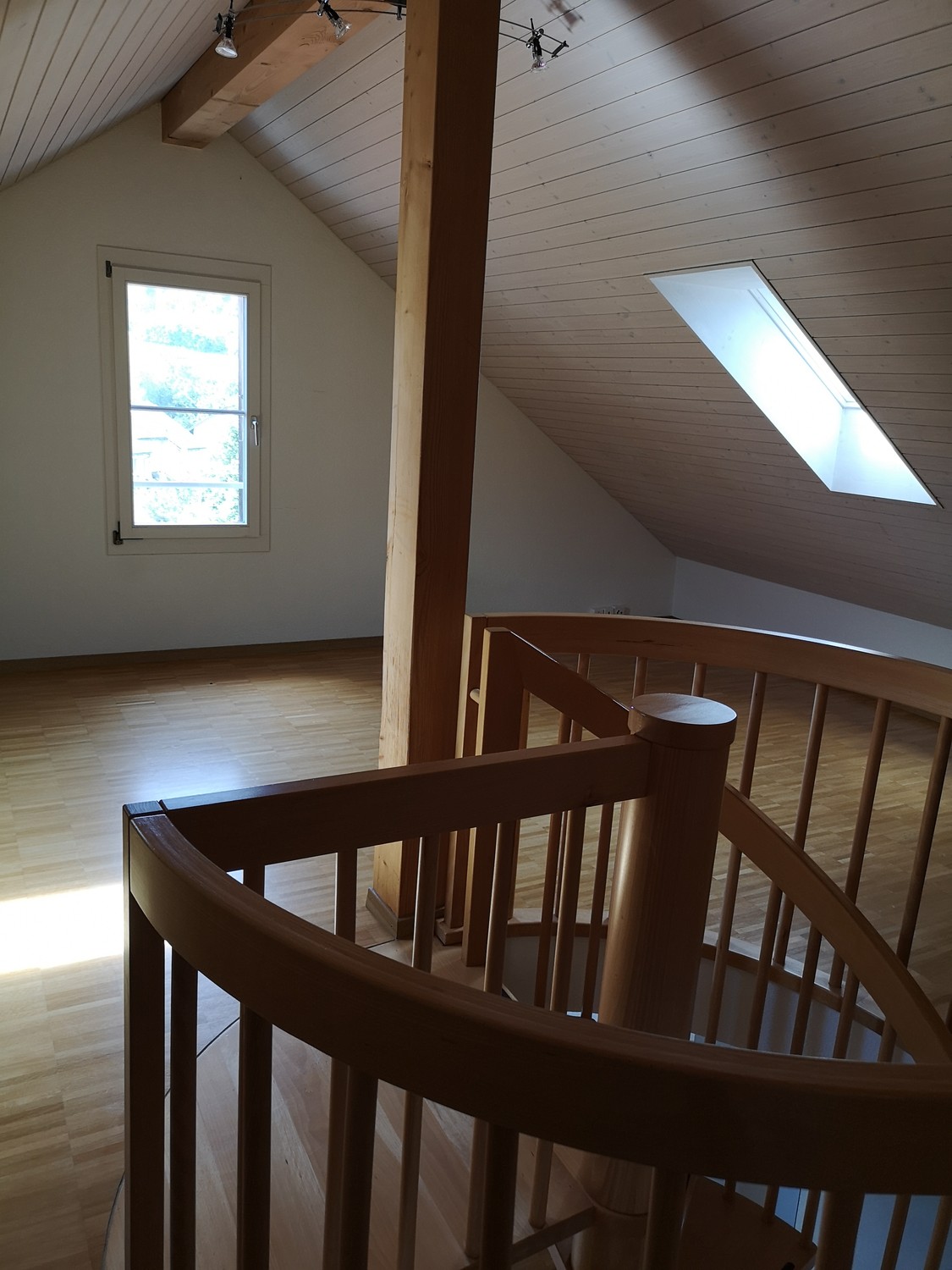 Die Wohnung im Dachgeschoss ist gut isoliert und mit modernen Fenstern ausgestattet. Der 39 m^2 Estrich bietet zusätzlichen Wohnraum und ein Badezimmer, weshalb die Wohnung vom Platzangebot her eher einer 4.5 Zimmer Wohnung entspricht.