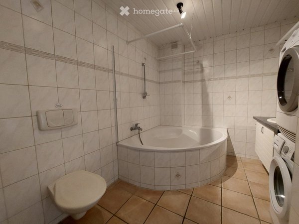 Salle de bains/WC avec baignoire d'angle, machine à laver et à sécher