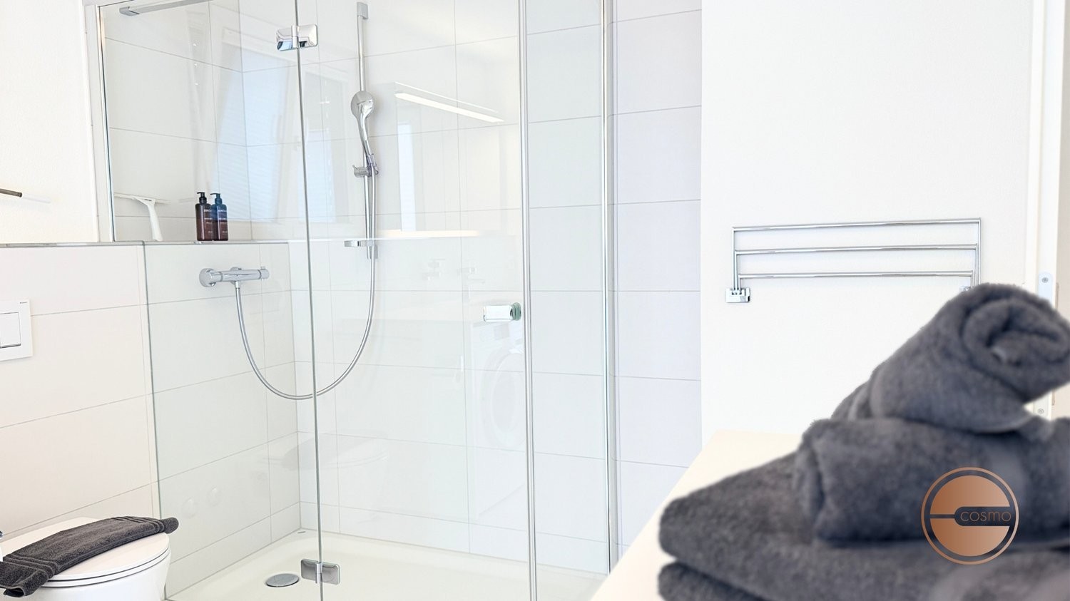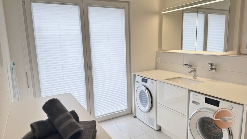 Das Badezimmer bietet Luxus mit einer geräumigen Walk-in-Dusche, Fussbodenheizung und modernen Miele-Waschmaschinen und -Trocknern.