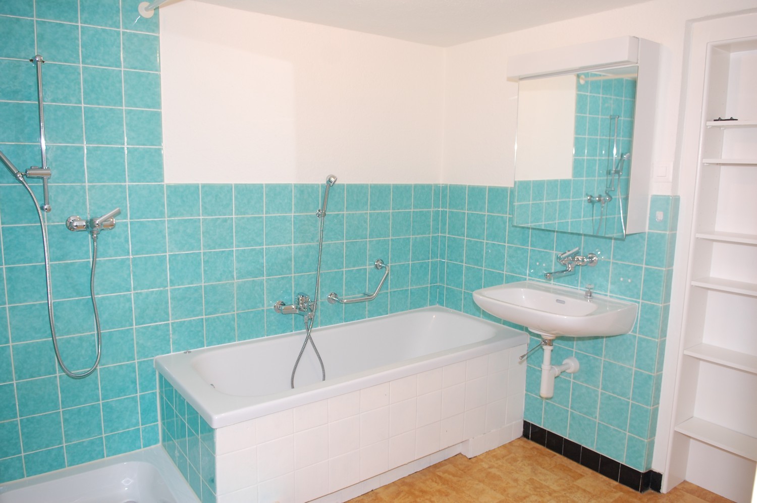 - Badezimmer mit Badewanne, Dusche und Einbauregal