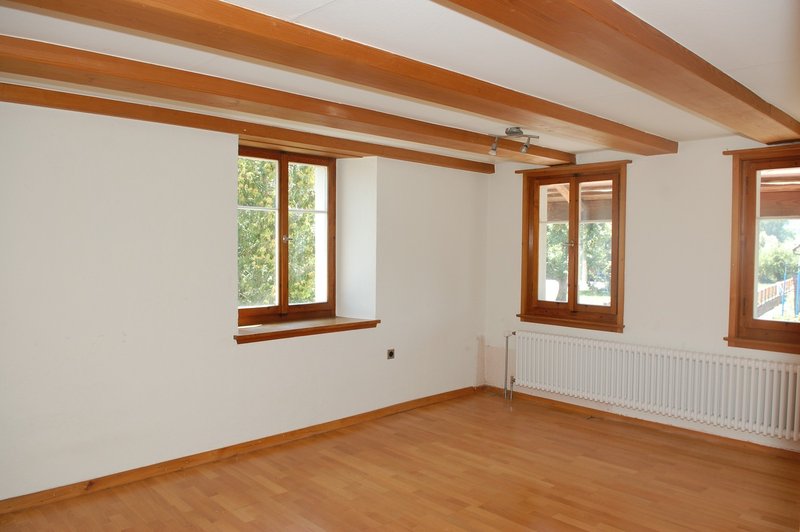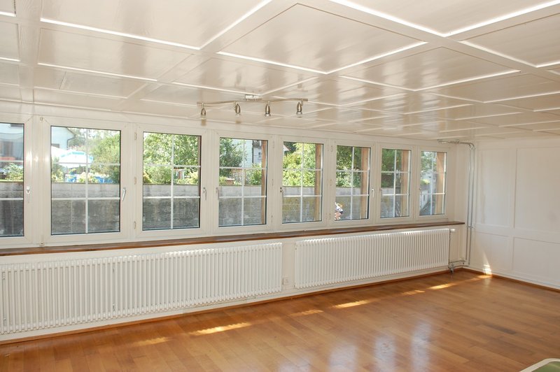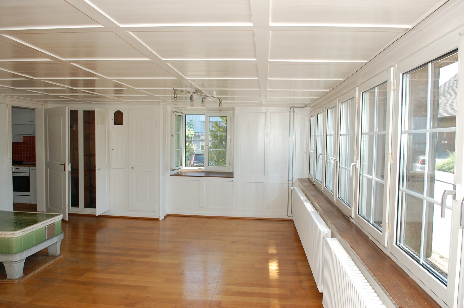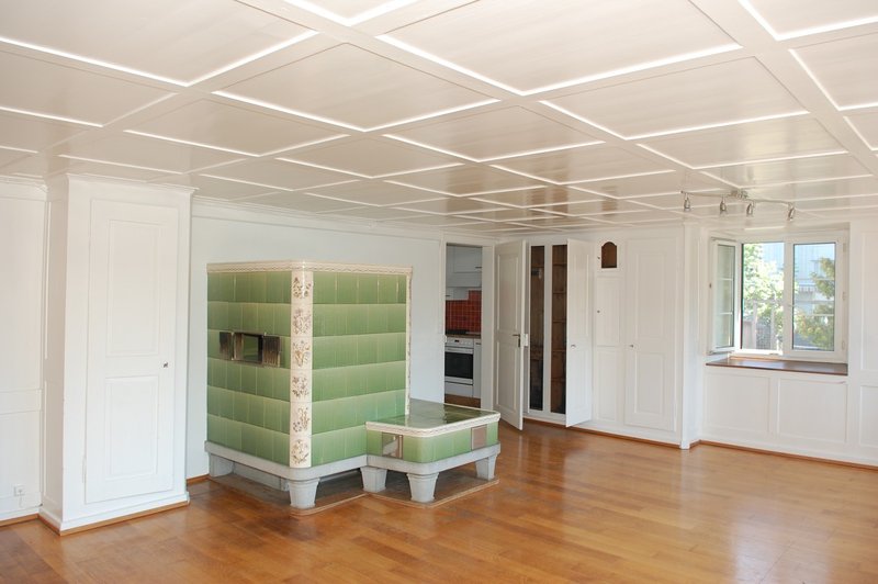 - gemütliches und grosszügiges Wohn-/Esszimmer mit Parkettboden, vielen Fenstern und nostalgischen Kachelofen