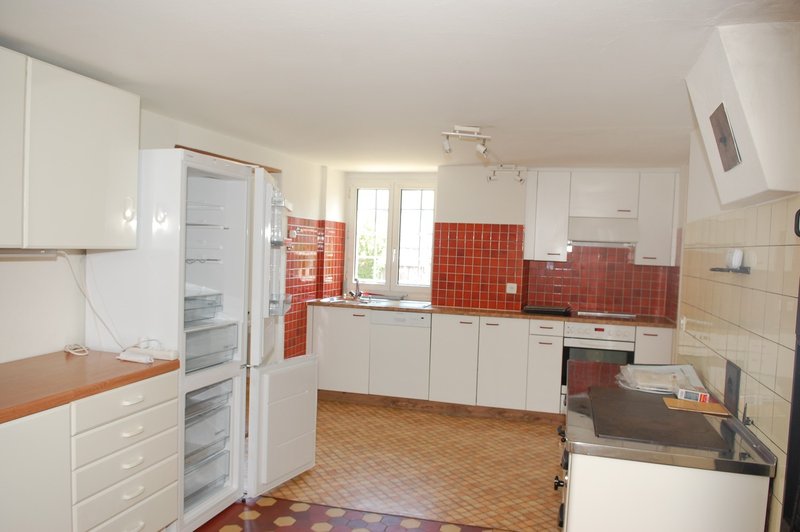 - Küche mit Holzarbeitsflächen, Geschirrspüler, Dunstabzug, Glaskeramik Herd, grossem Kühlschrank, Backofen, Fenstern und grosszügigem Platz