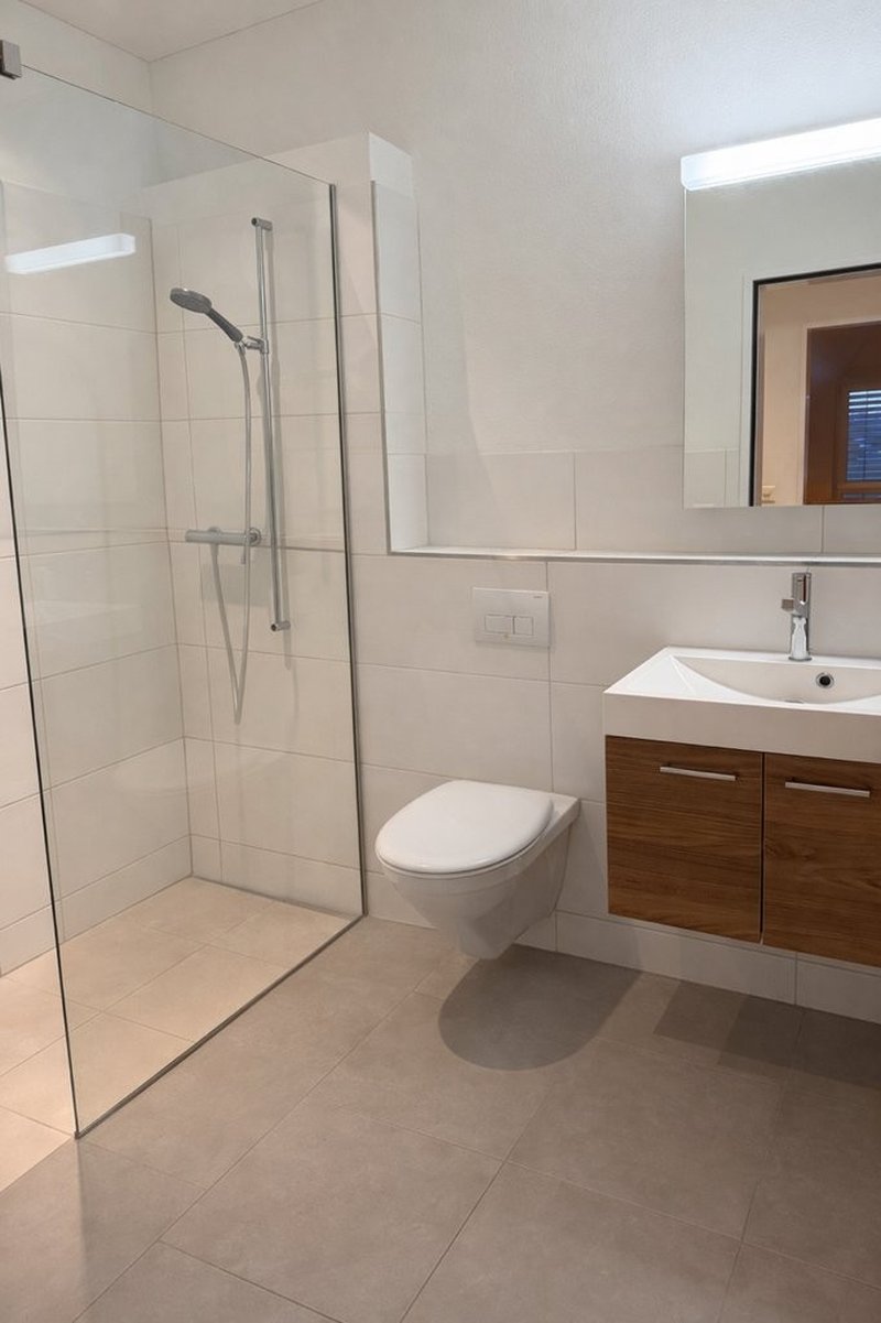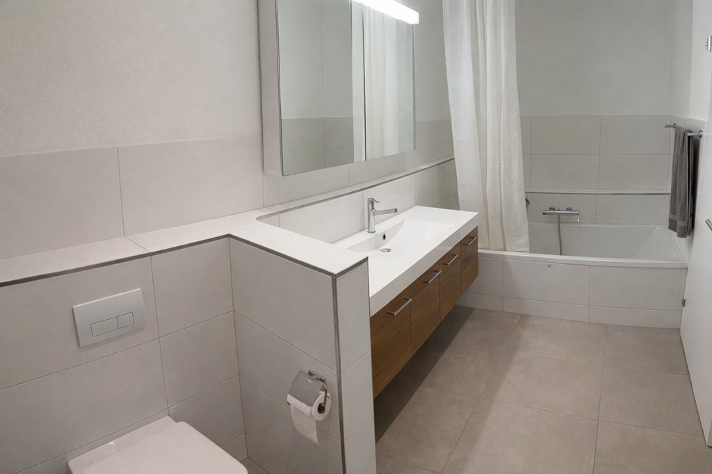 Zwei moderne Nasszellen: Ein Badezimmer mit Badewanne, Lavabo und WC sowie ein separates Bad mit grosszügiger Dusche, Lavabo und WC.