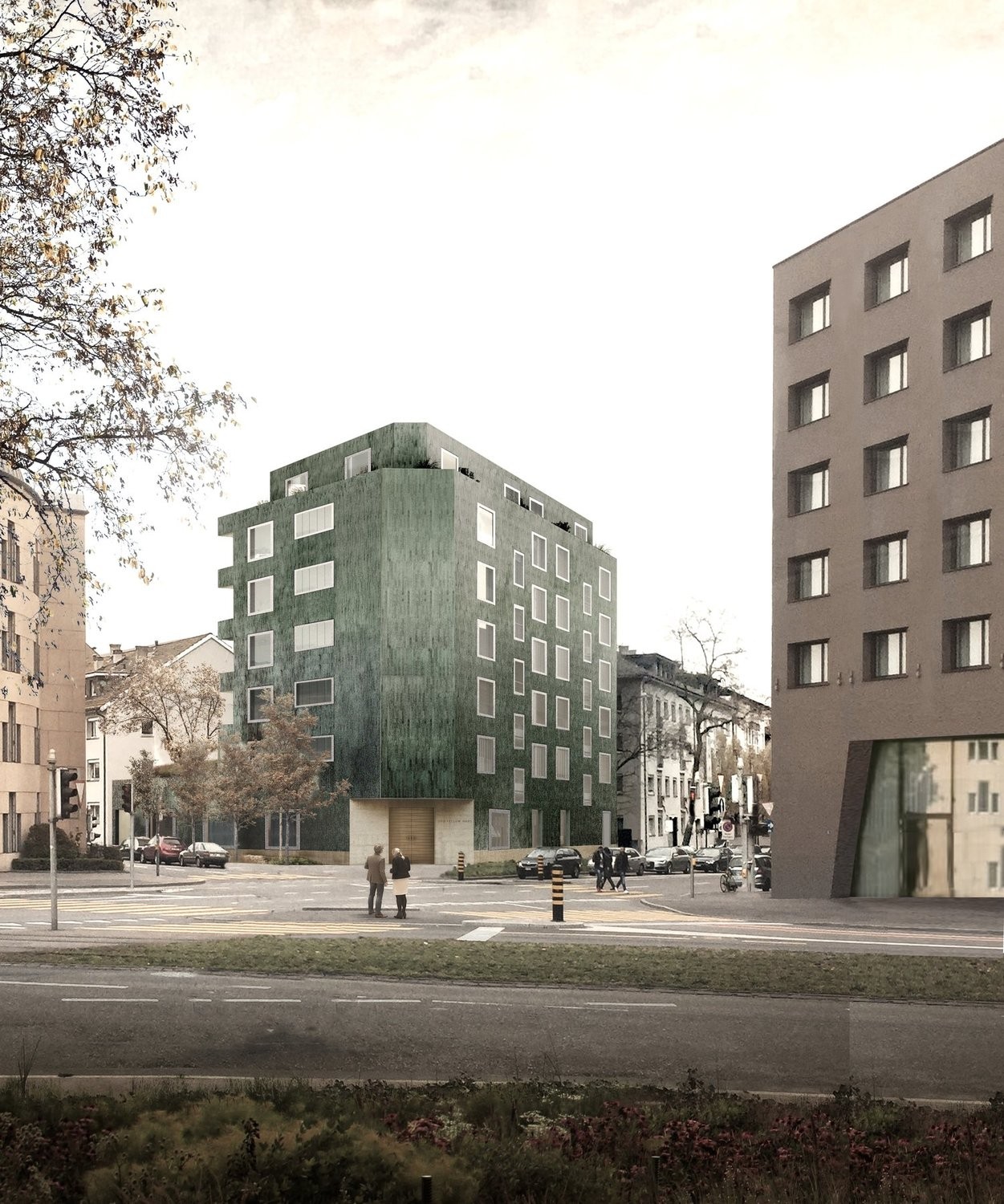 Mit der dreiseitigen Orientierung des Gebäudes entsteht an der Ecke Grosspeterstrasse / Jacob Burckhardt-Strasse ein ausgeprägter Kopfbau, welcher städtebaulich die angrenzenden Gebäudedimensionen aufnimmt.