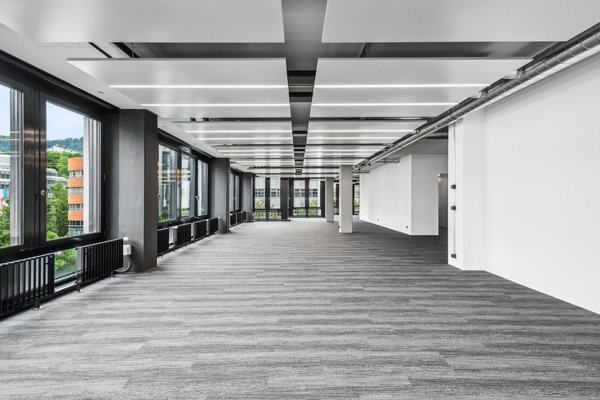 Zusätzlich besteht die Möglichkeit, die Räumlichkeiten im erweiterten Grundausbau zu mieten. Für einen Zuschlag von CHF 20.-/m² pro Etage wird ein Plattenteppich eingebaut sowie die Wände und Decke verputzt und weiss gestrichen.