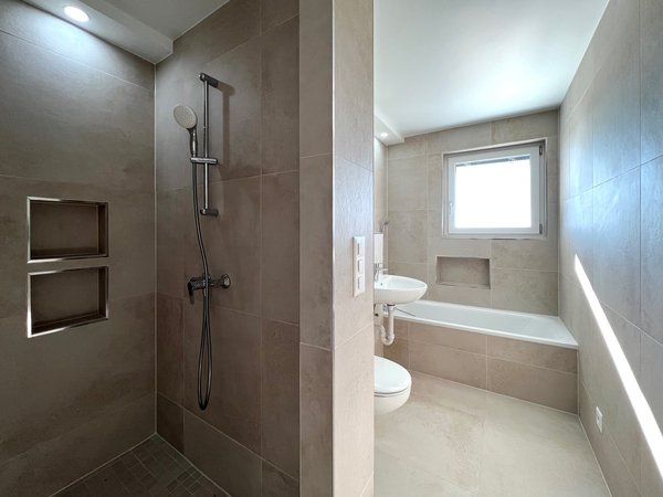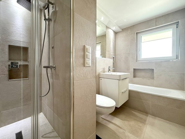 Zeitgemässes Badezimmer: Klein, aber fein mit begehbarer Dusche und Badewanne