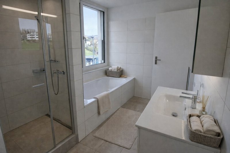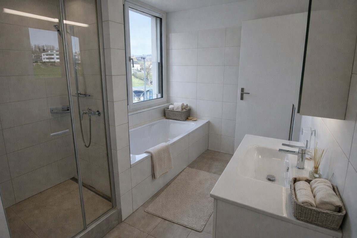 Bad mit Badewanne, Dusche, Lavabo, WC und Fenster