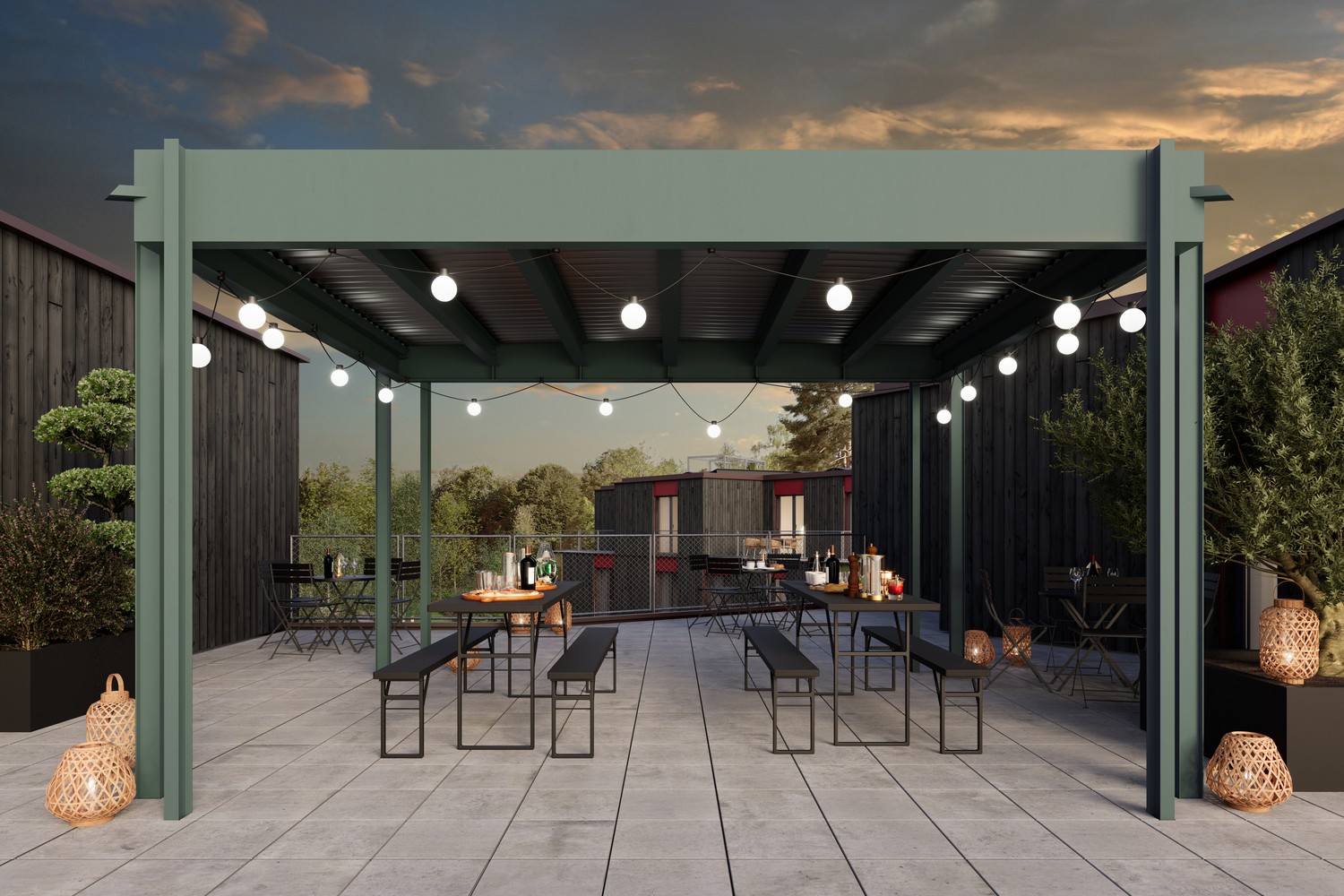 Auf über 26m2 Fläche finden alle Outdoormöbel wie Gartenlounges, Tische und Pflanzen genügend Platz.
