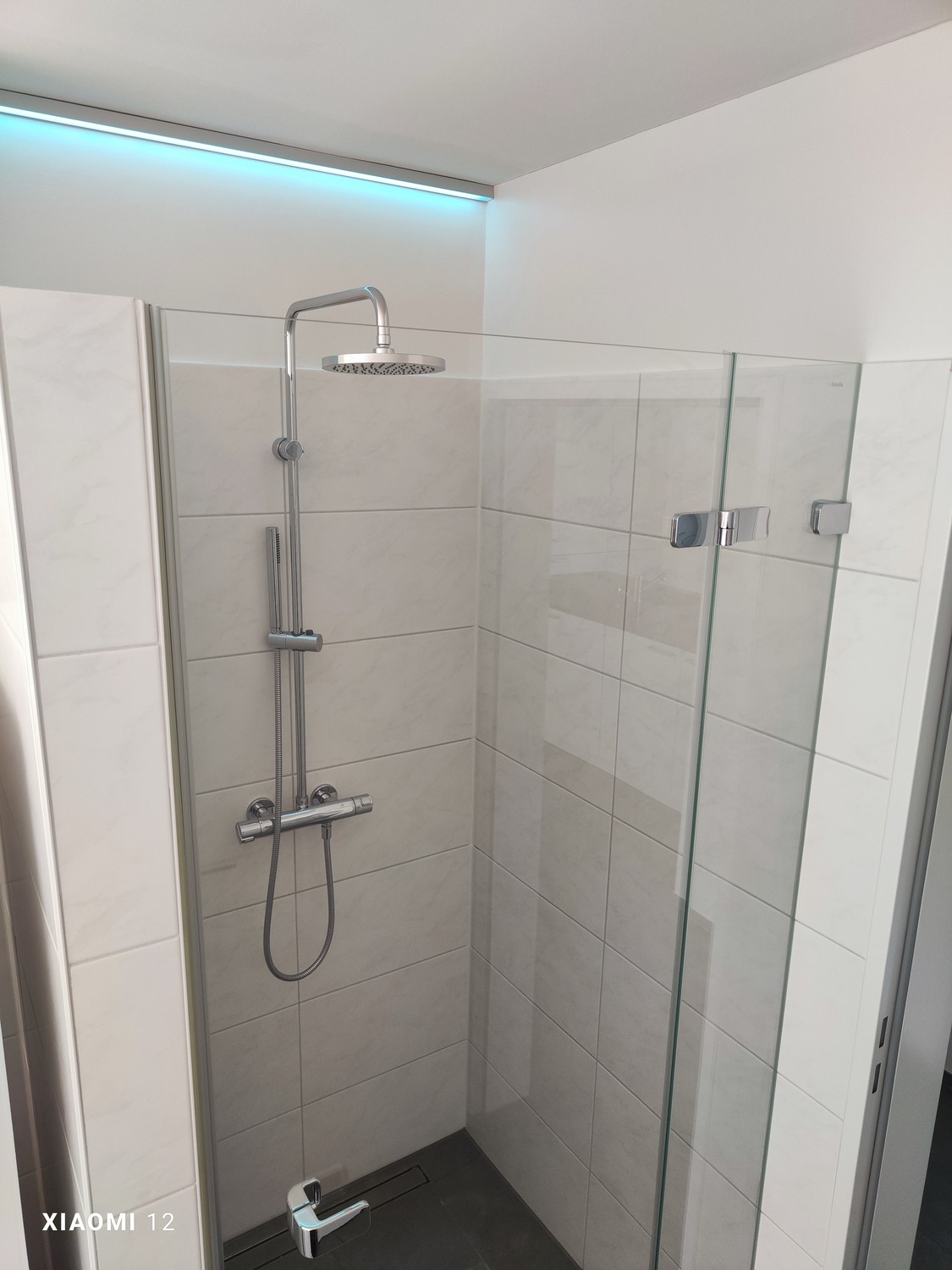 Bad mit grossem Lavabo, Fenster, Badewanne und Regendusche mit LED-Beleuchtung