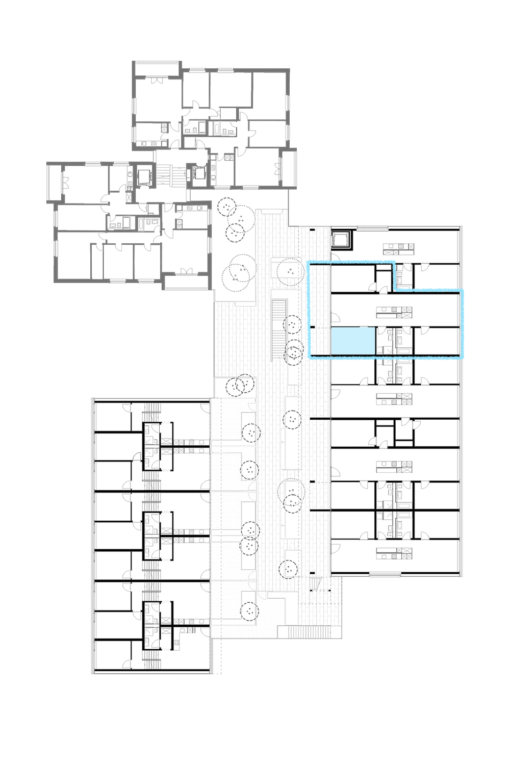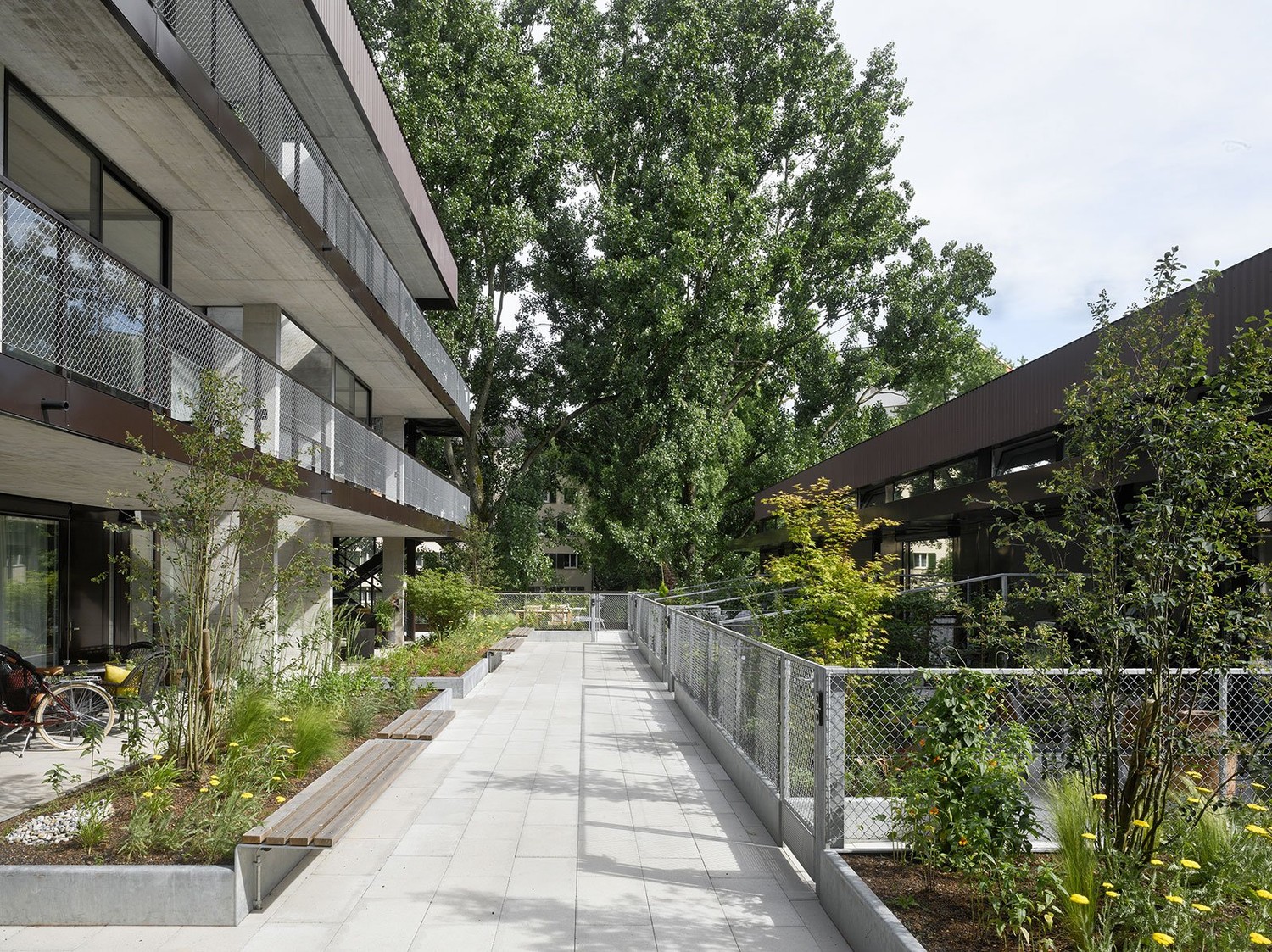 Die Wohnung verfügt über ein grosses Wohn- und Esszimmer, eine moderne Küche sowie eine eigene Waschmaschine und einen Tumbler. Zudem kommt einmal pro Woche eine Reinigungskraft. Das Gebäude befindet sich direkt an einer Bushaltestelle und im Erdgeschoss gibt es einen sehr dezenten Coop. Der Zugang zur Wohnung erfolgt über einen Laubengang mit vielfältiger natürlicher Bepflanzung, der auch als Treffpunkt für die Nachbarschaft dient. Auf dem gleichen Geschoss befinden sich weitere WGs mit jungen und ruhigen Bewohnerinnen und Bewohnern.