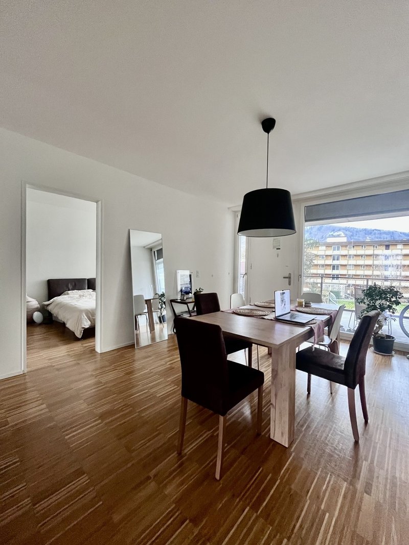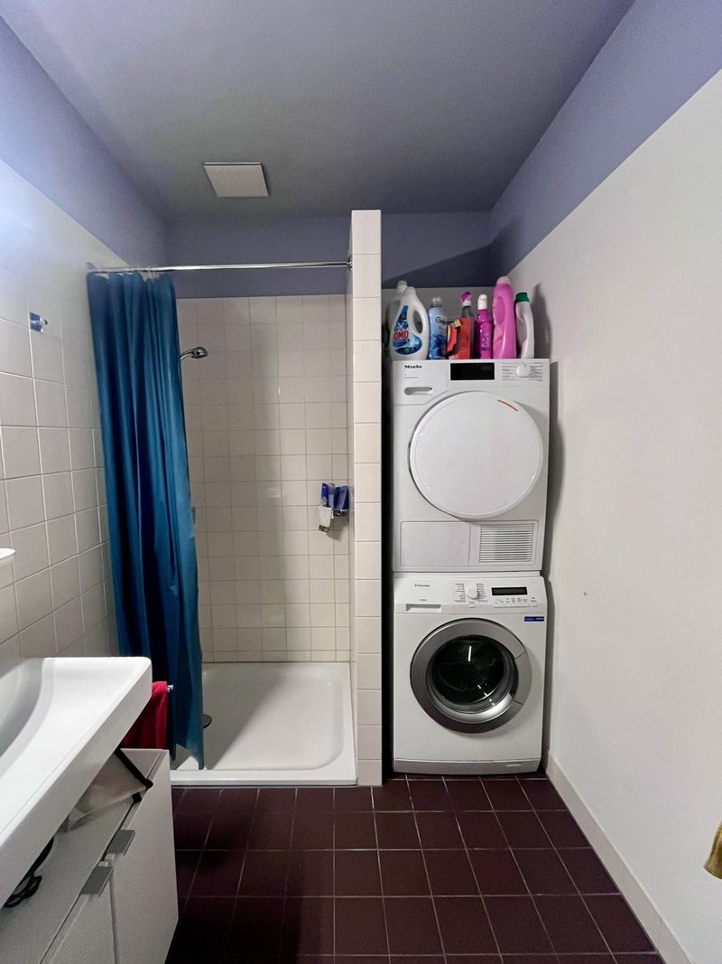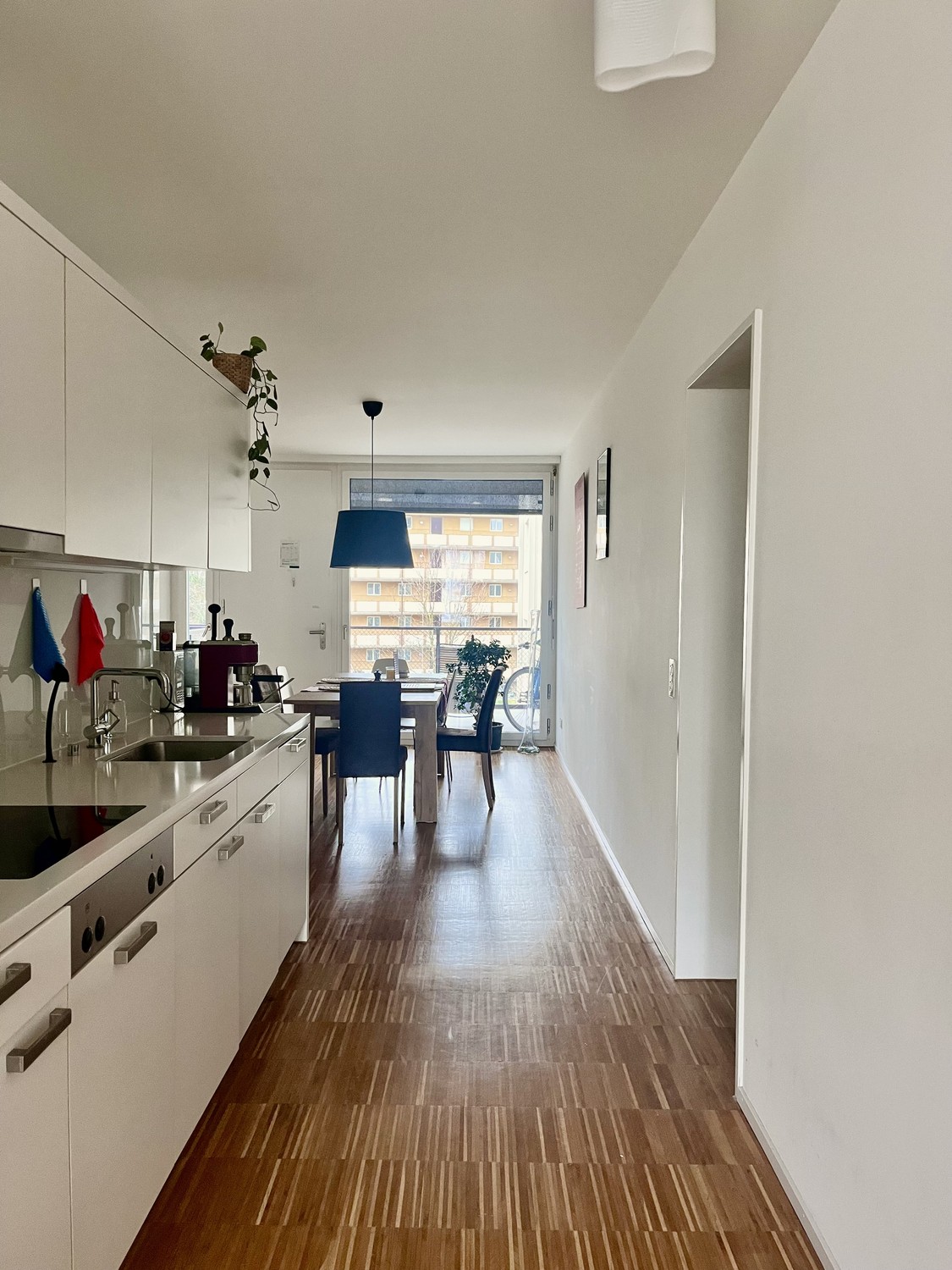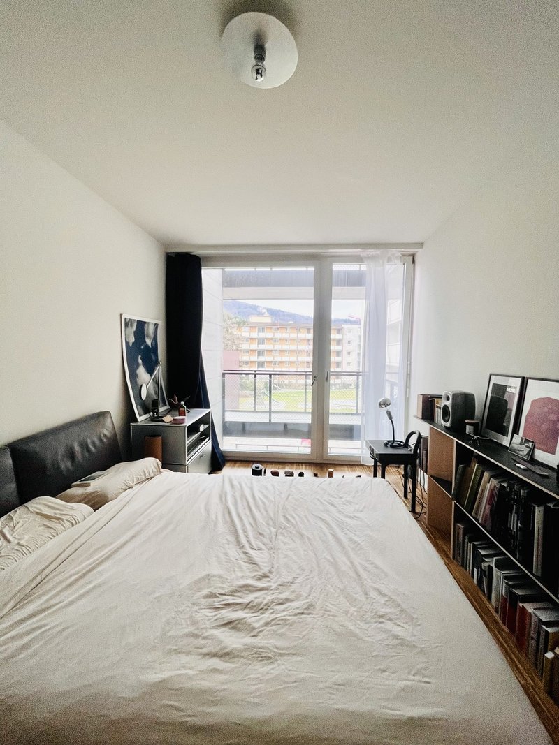 The apartment features a spacious living and dining area, a modern kitchen, and its own washing machine and dryer. A cleaning service comes once a week. The building is located directly next to a bus stop, and there is also a very discreet Coop supermarket on the ground floor. The apartment is accessed via a planted open corridor, which also serves as a pleasant meeting point for neighbors. On the same floor, there are other shared apartments with young and quiet residents.