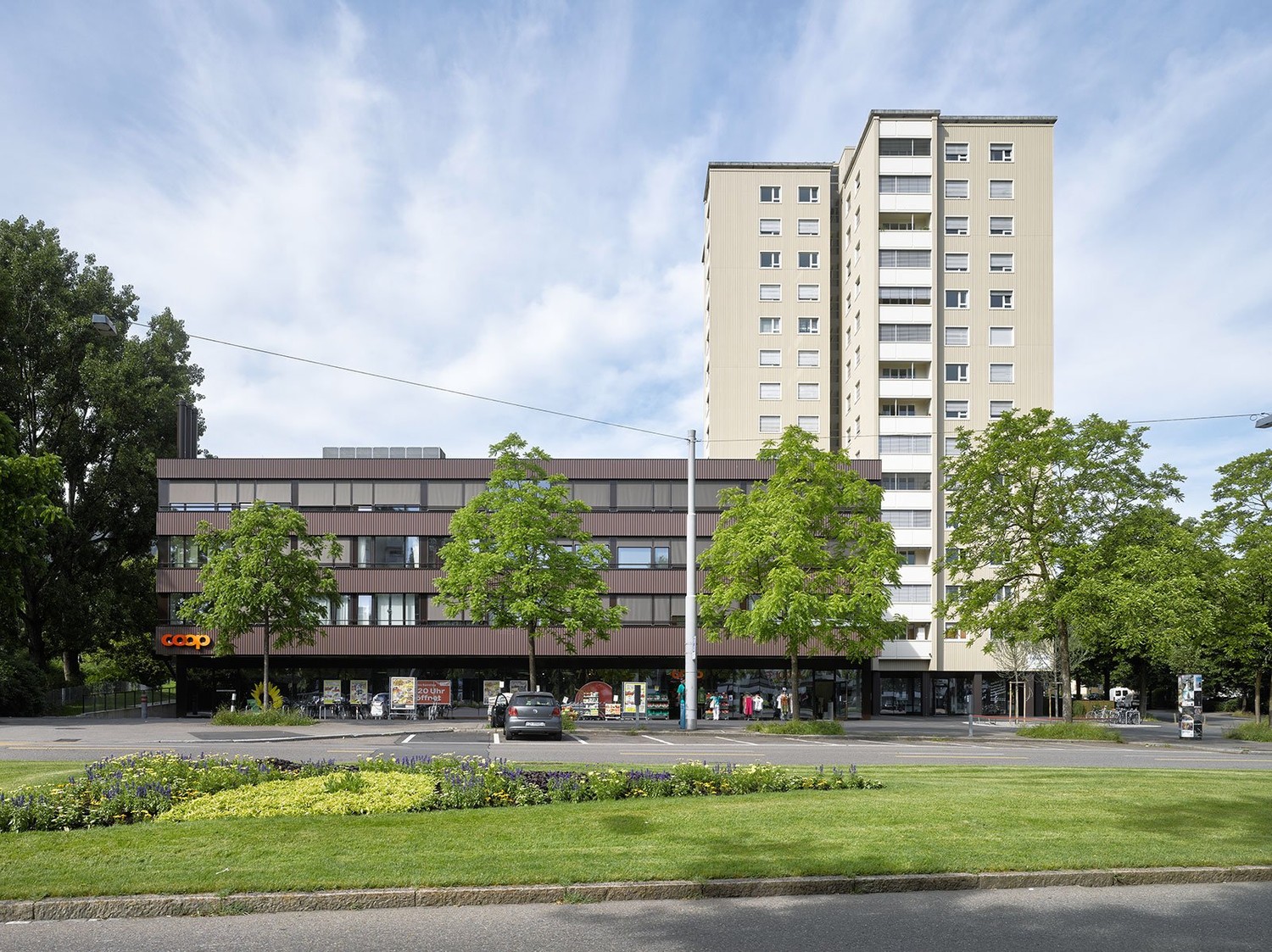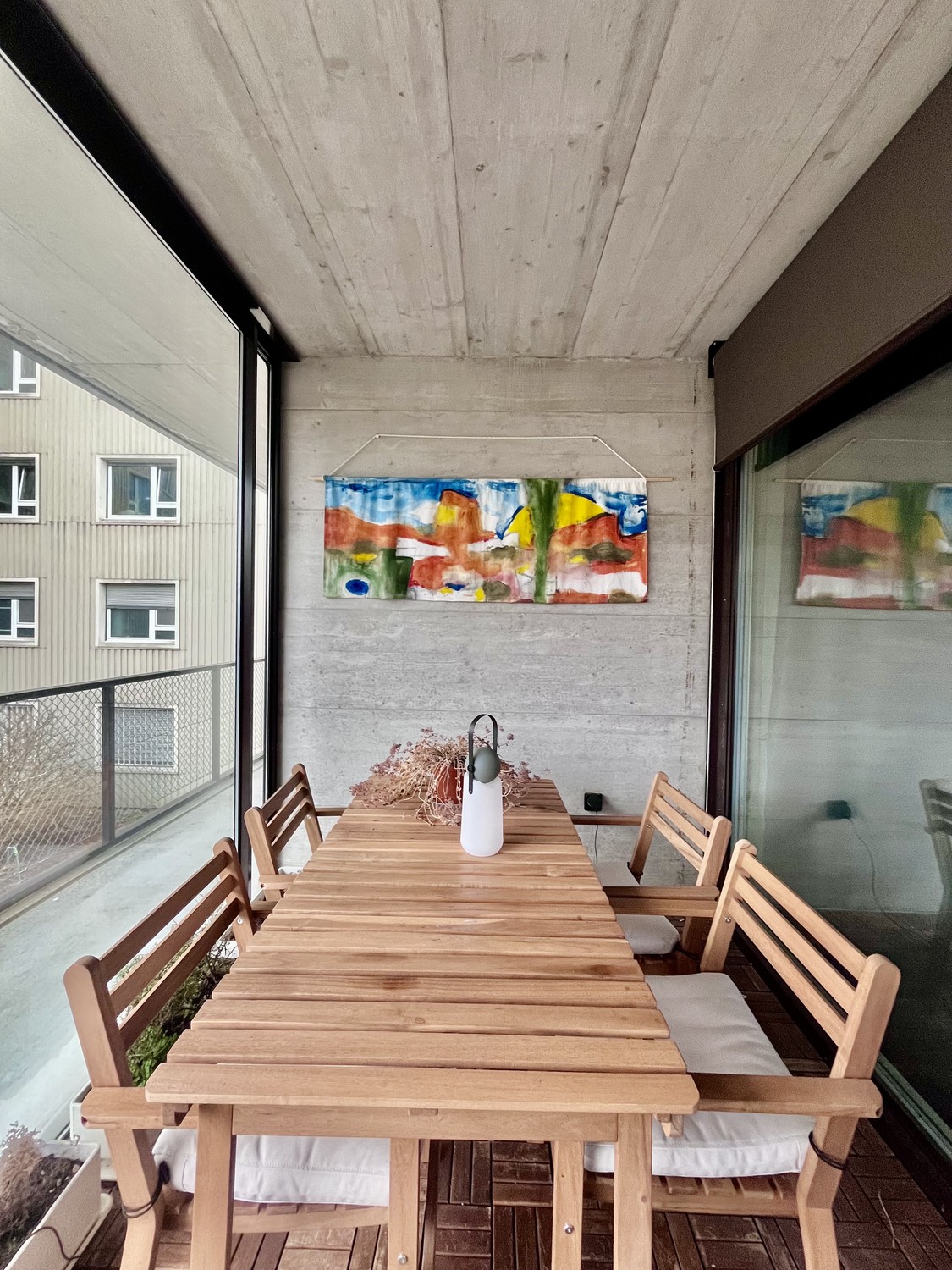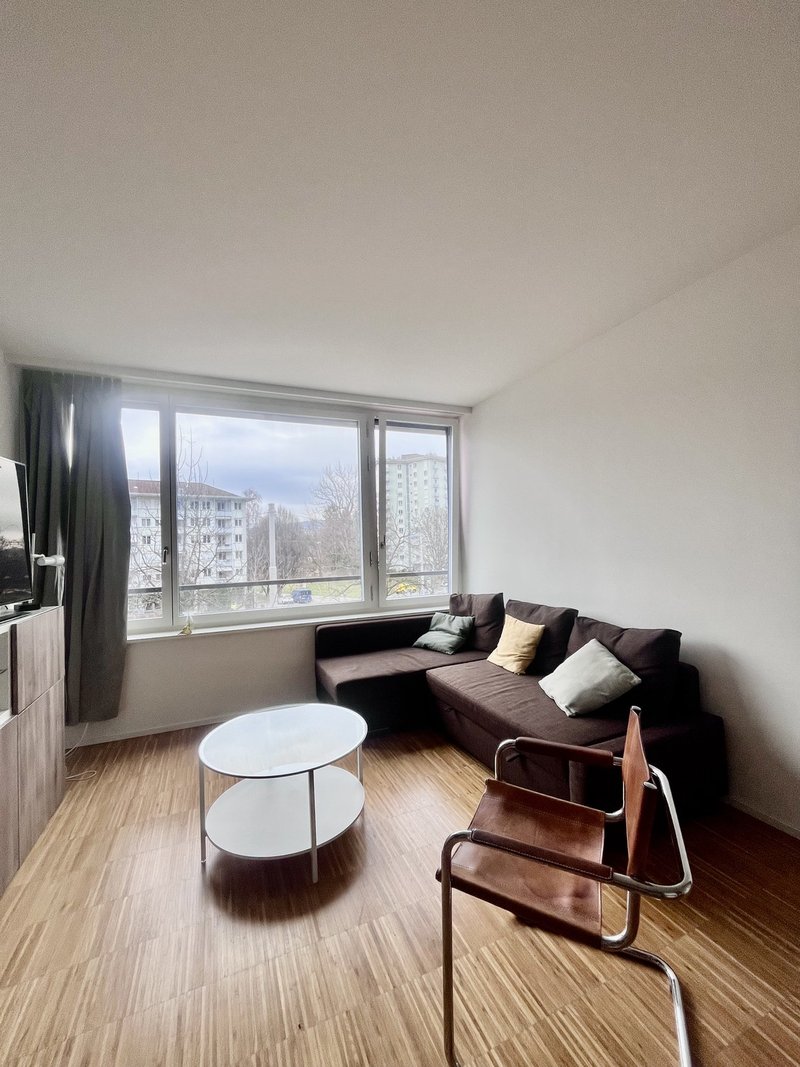 The apartment features a spacious living and dining area, a modern kitchen, and its own washing machine and dryer. A cleaning service comes once a week. The building is located directly next to a bus stop, and there is also a very discreet Coop supermarket on the ground floor. The apartment is accessed via a planted open corridor, which also serves as a pleasant meeting point for neighbors. On the same floor, there are other shared apartments with young and quiet residents.
