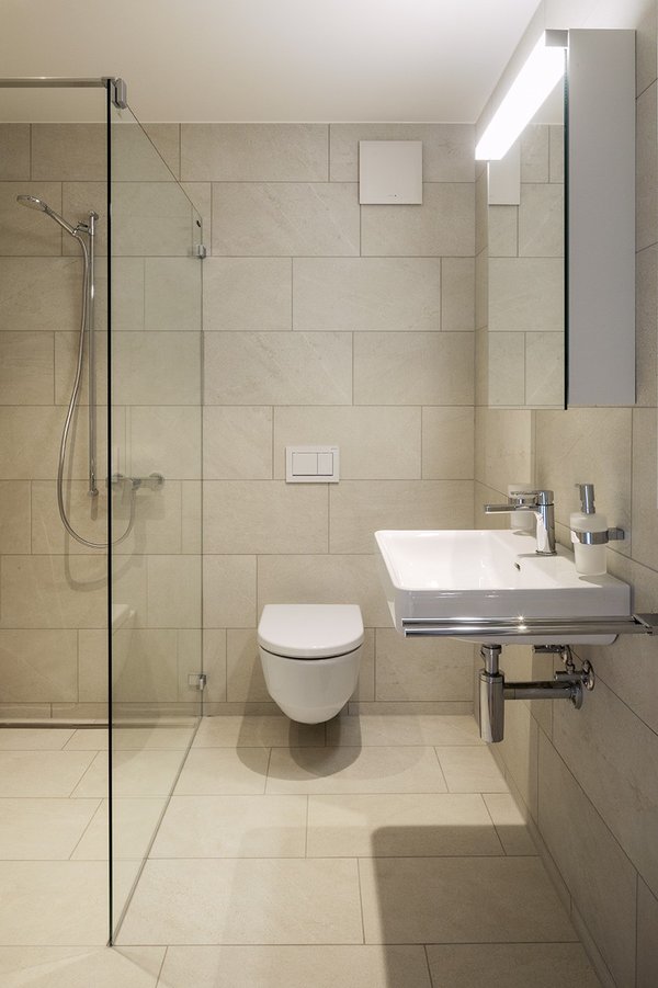 Modernes Badezimmer: Mit beigen Fliesen, Duschbereich mit Glasabtrennung und zeitgemässer Ausstattung