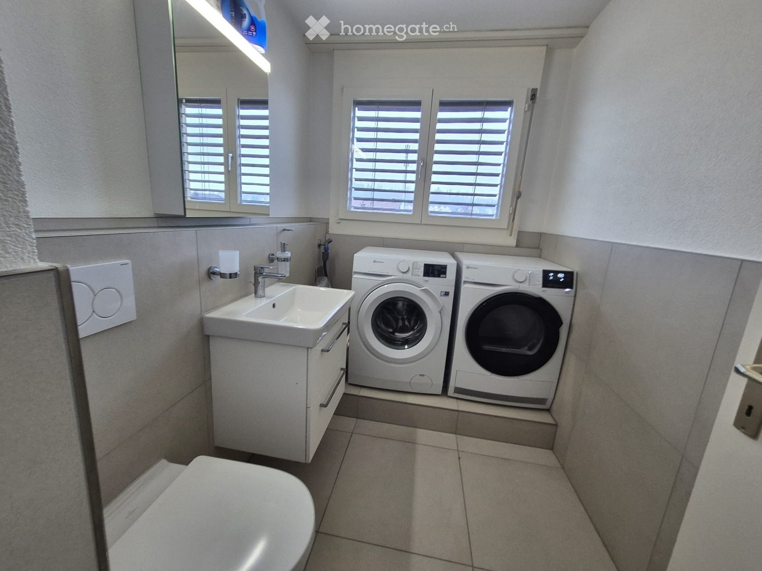 Praktischer Waschbereich: Separater Raum mit Waschmaschine, WC und Trockner in der Wohnung. (Electrolux Waschmaschine & Tumbler)
