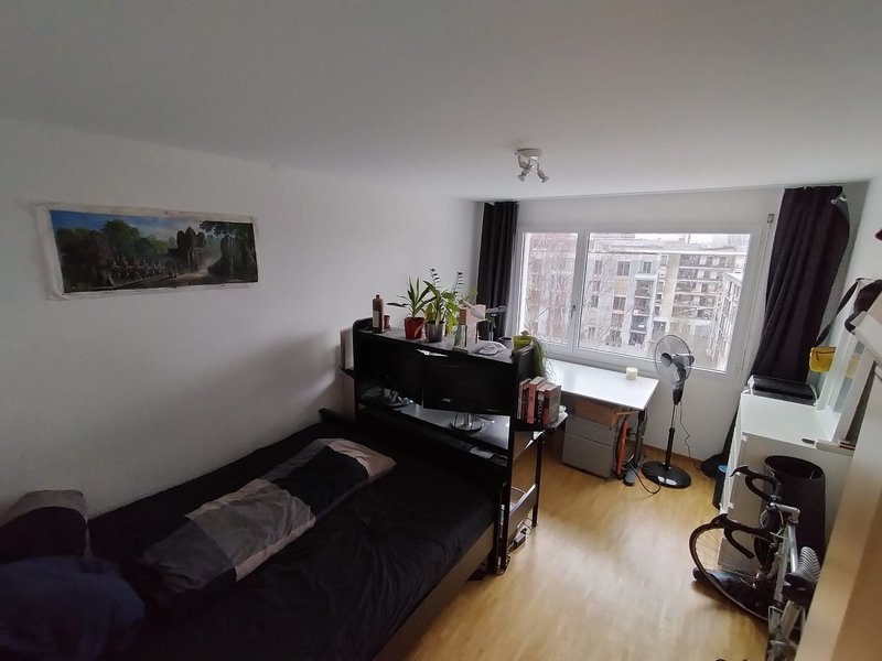Das Zimmer ist ca. 15m2 gross, hell. Es kann unmöbliert vermietet werden. Wir haben eine grosse Küche, ein geräumiges Wohnzimmer, zwei Badezimmer, ein Kellerabteil sowie einen Balkon mit super Aussicht und Mittagssonne.