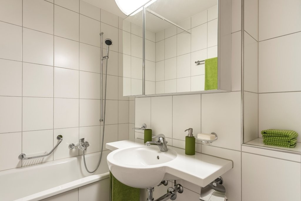 - Badezimmer mit WC, Lavabo, Spiegelschrank und Badewanne