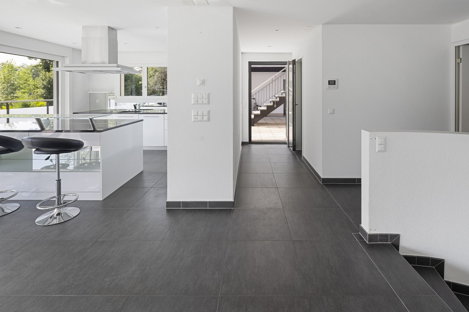 Schon beim Eintreten erleben Sie das grosszügige Raumgefühl. Die raumhohen Fensterfronten öffnen den Blick ins Freie und holen Licht und Natur ins Innere. Vom Entrée gelangen Sie in den offen gestalteten Wohn- und Essbereich. Die moderne Küche ist perfekt integriert und bietet viel Stauraum. Ein grosser Kellerraum ist ideal für Vorräte, Geräte oder einfach für das alltägliche Ordnunghalten. Auf dieser Etage befindet sich auch ein separates Gäste-WC.