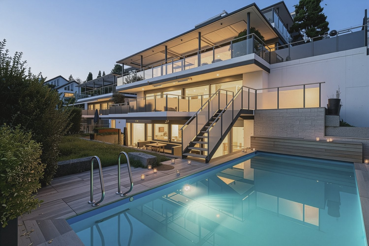 Die über 120 Quadratmeter grosse Terrasse ist ein echter Höhepunkt dieses Schmuckstücks. Sie geht fliessend in den Gartenbereich über, wo der schön eingebettete Pool, das Wasserspiel mit Licht und die Abendsonne für entspannte Stunden sorgen. Ob Grillabend mit Freunden, ein Sprung ins kühle Nass oder einfach nur Ruhe im Grünen hier ist Lebensqualität viel mehr als ein Verkaufsargument!