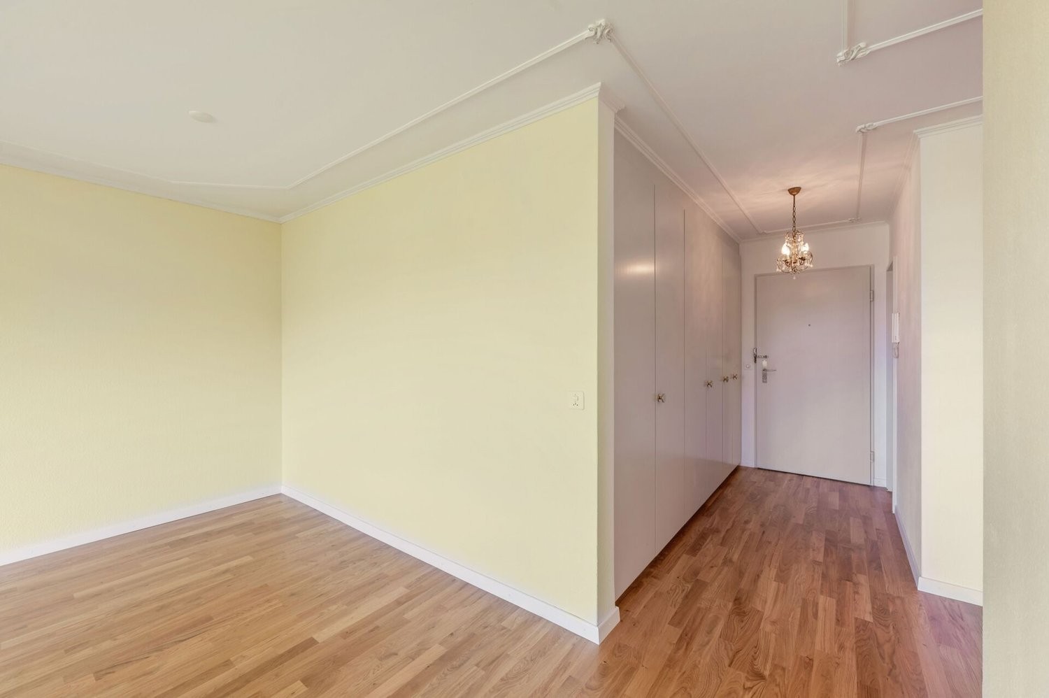 Die helle Wohnung mit einer Nettowohnfläche von 76 m² befindet sich im 5. Obergeschoss, der obersten Etage, und ist bequem per Aufzug erreichbar. Der Eingangsbereich ist mit Einbauschränken ausgestattet und bietet viel Stauraum für Jacken, Schuhe und persönliche Gegenstände. Direkt daneben liegt der Nassraum mit Badewanne, Toilette, Lavabo, Spiegelschrank, privater Waschmaschine sowie diversen praktischen Einbauschränken.