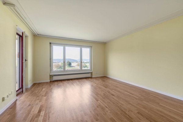 Der helle Wohn- und Essbereich grenzt direkt an das Entrée und bietet Zugang zu einem westseitig orientierten Balkon, der am Abend von der Sonne verwöhnt wird. Große Fensterfronten lassen zudem viel Tageslicht herein und eröffnen einen weiten Blick über die Felder, ins Grüne und bis zur Limmat. Die Küche ist mit dem nötigen Komfort ausgestattet und bietet zusätzlich Platz für einen kleinen Tisch, ideal für gemütliche Mahlzeiten oder einen schnellen Kaffee zwischendurch. Im hinteren Bereich der Wohnung befinden sich zwei Arbeits- beziehungsweise Schlafzimmer, die besonders Ruhe und Rückzug bieten.