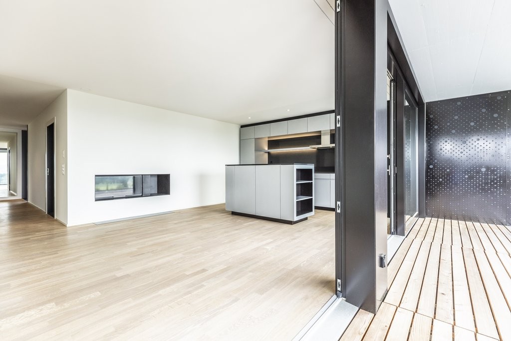 Die gesamte Wohnung, ausser den Nasszellen, ist mit einem weiss geölten Eichenboden ausgestattet, der eine warme und stilvolle Wohnatmosphäre schafft.