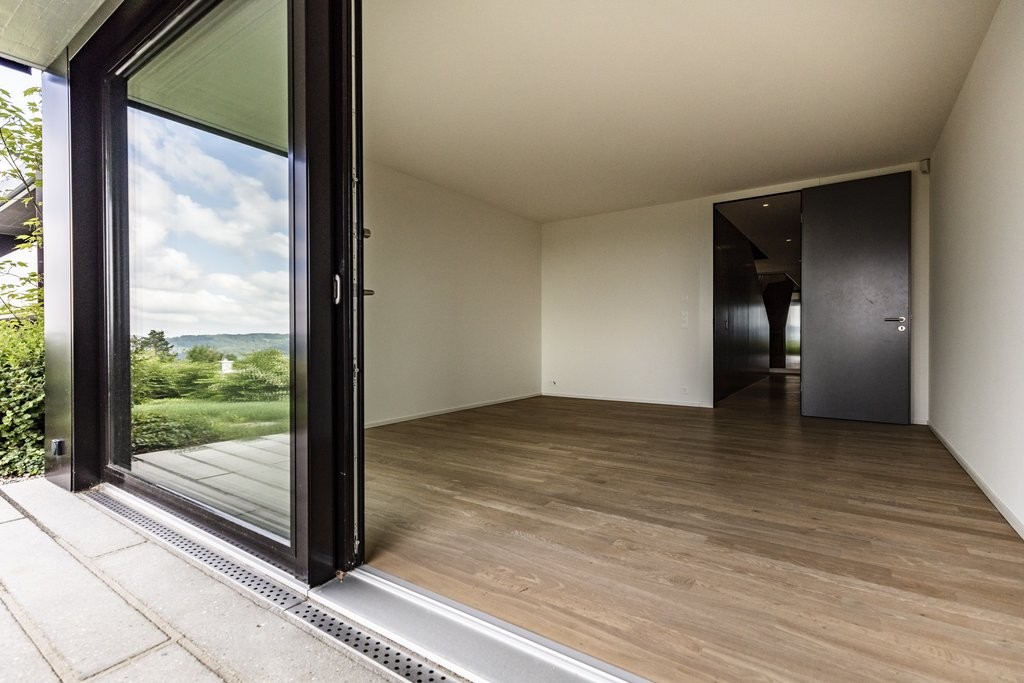 Geräumiges, lichtdurchflutetes Wohnzimmer mit Cheminée und direktem Balkonzugang sowie herrlicher Weitsicht