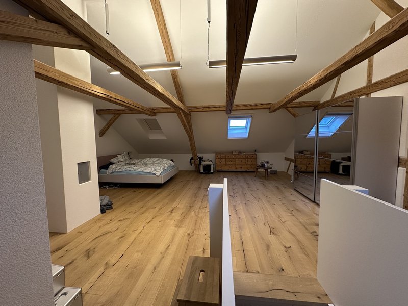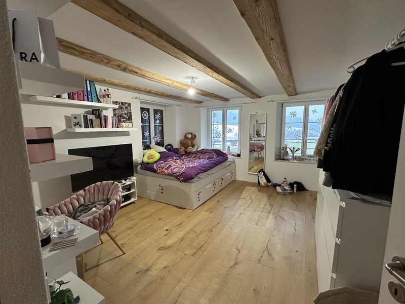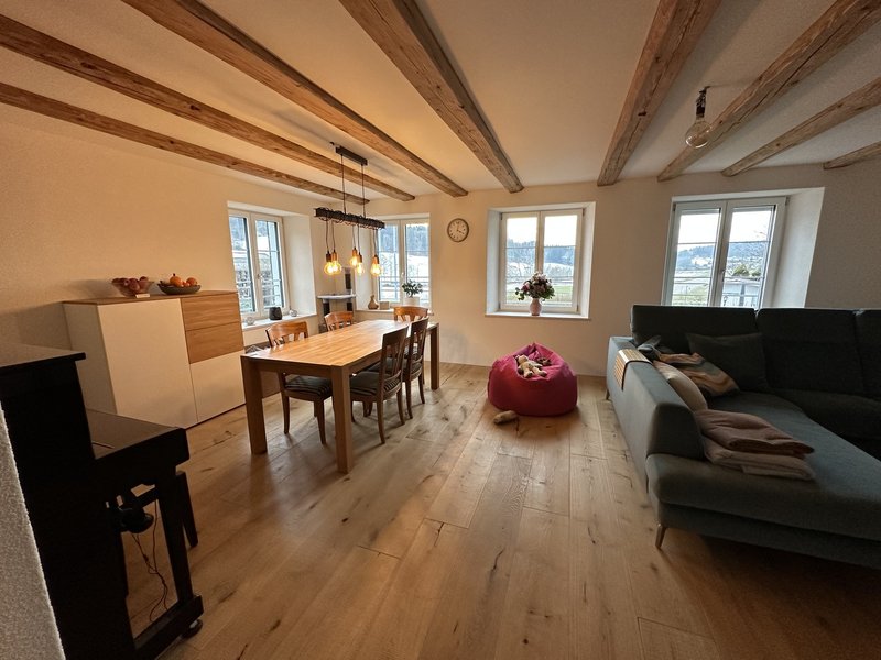 Top saniertes 6 1/2 Zimmer Bauernhaus mitten im Grünen zu vermieten. Nettomiete: CHF 3990.-- / Mietbeginn: 1.3.26 / Wohnfläche: 235 m2 / Vertragsdauer: bis mind. 30.9.2028