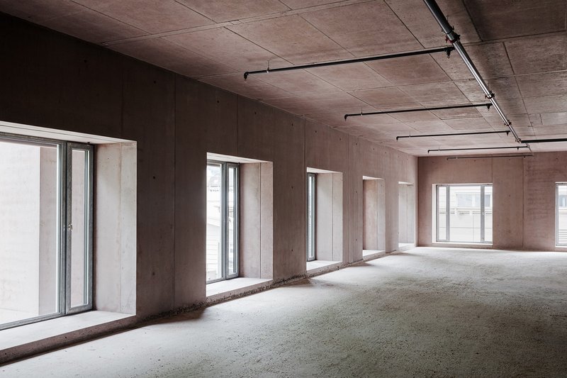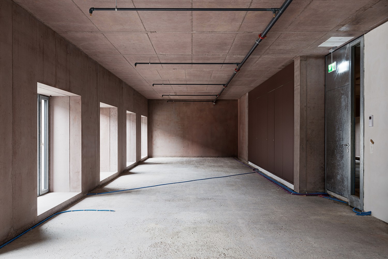 - Wände und Decken in Rot eingefärbten Sichtbeton