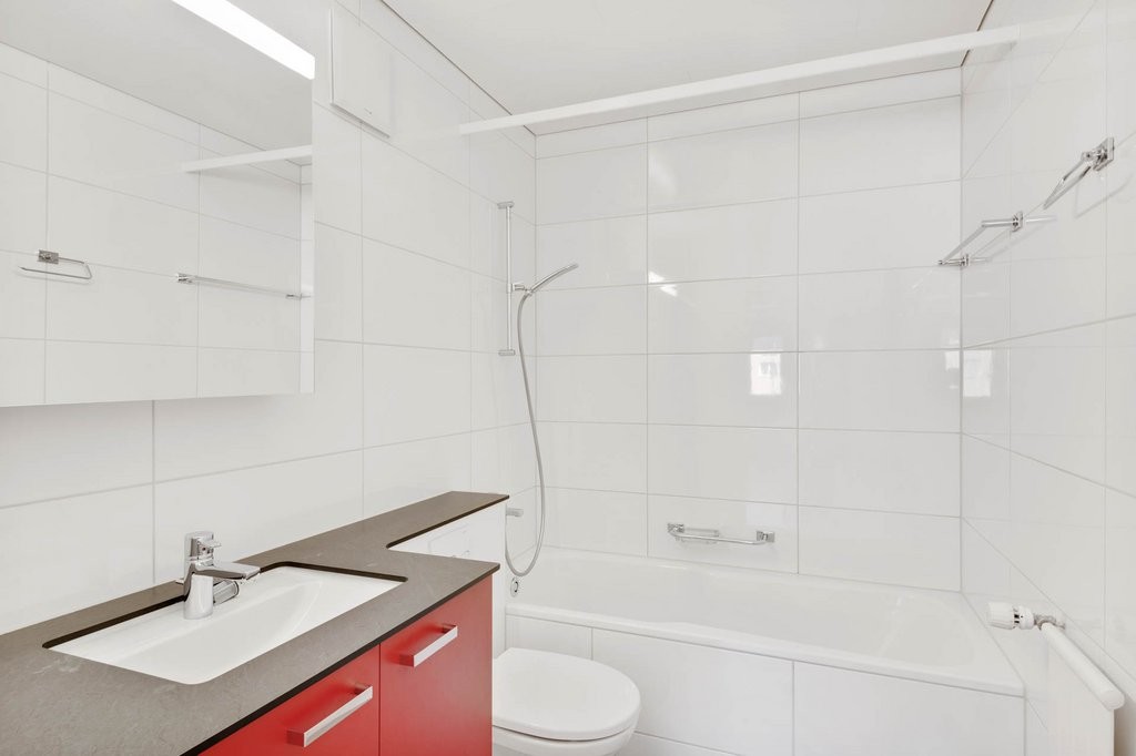- Badezimmer mit WC, Lavabo, Spiegelschrank und Badewanne