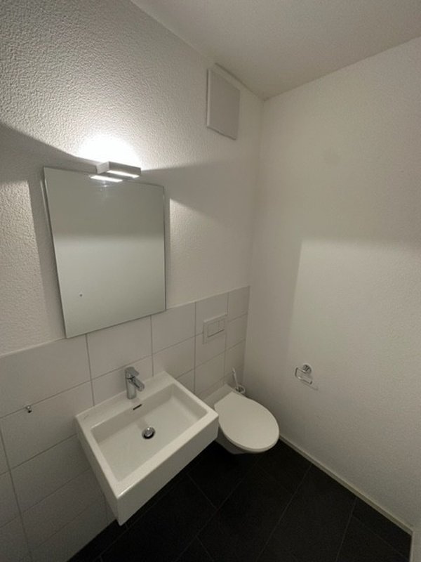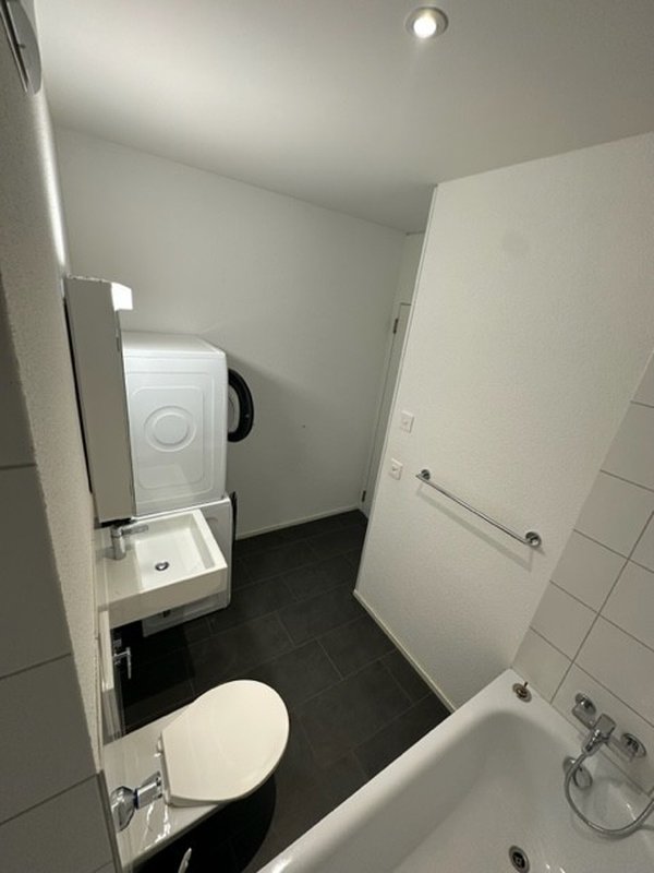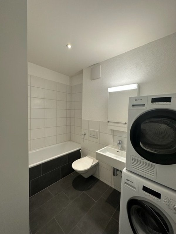 Grosse offene Küche mit Geschirrspülmaschine und hochwertigen Elektrogeräten. Das moderne Bad mit WC ist mit einem eigenen Waschturm ausgestattet.