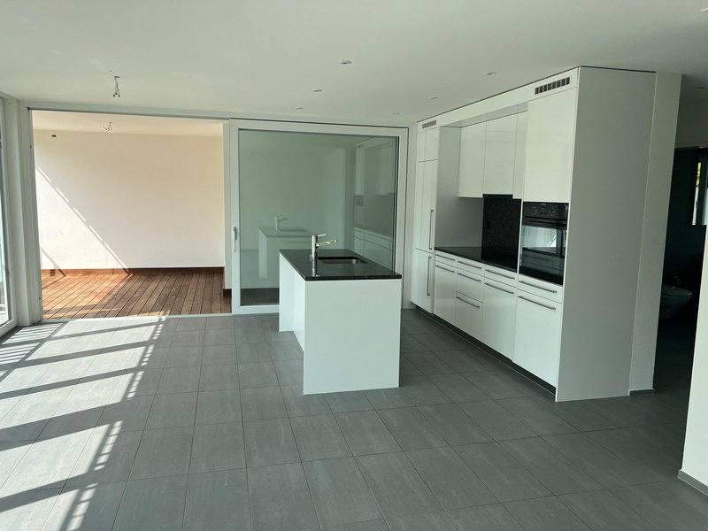 Die Wohnung verfügt über einen grosszügigen Wohn- und Essbereich mit moderner Küche und Kochinsel. Der gedeckte Wintergarten mit grosszügiger Glasfront erweitert den Wohnraum und sorgt für viel Licht.