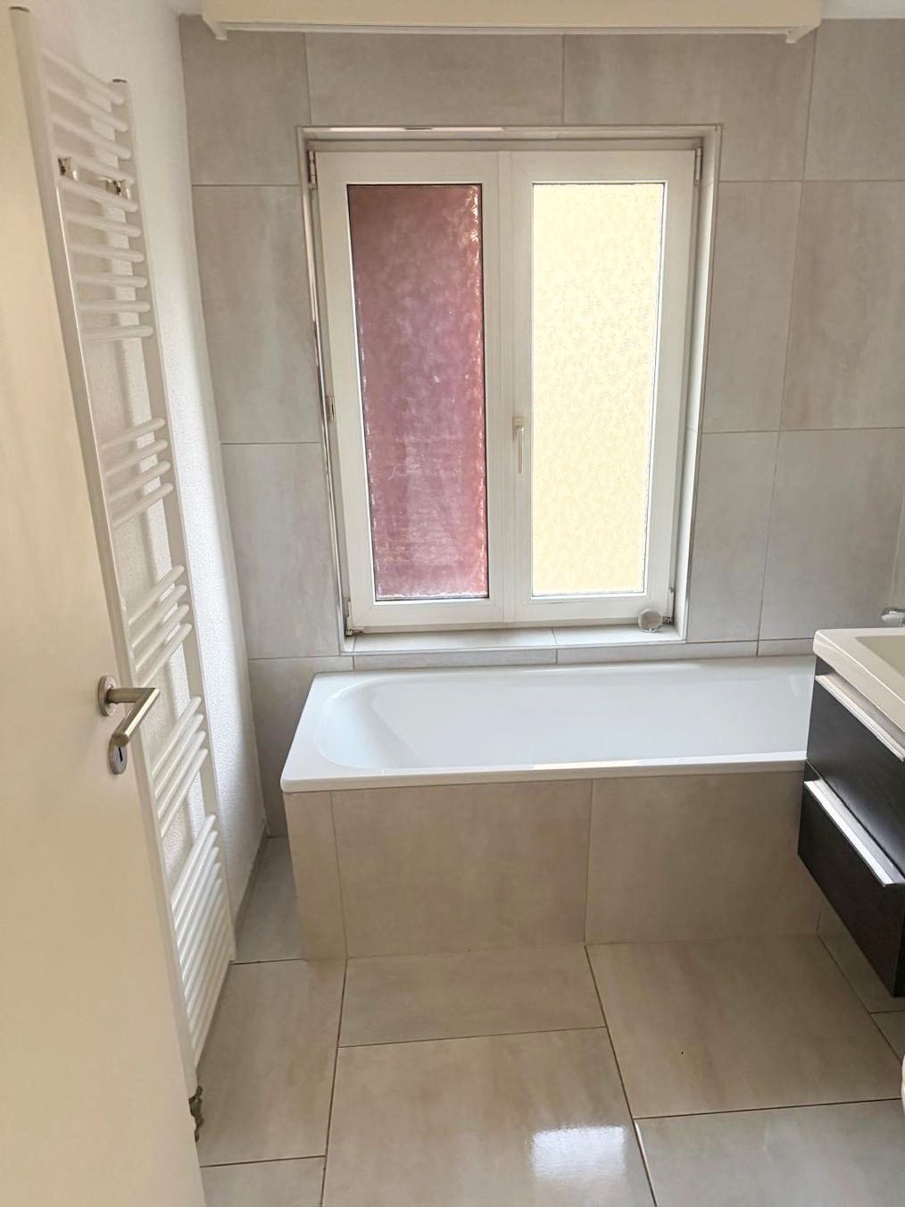 Badezimmer: Mit Badewanne, Waschbecken und Unterschrank.
