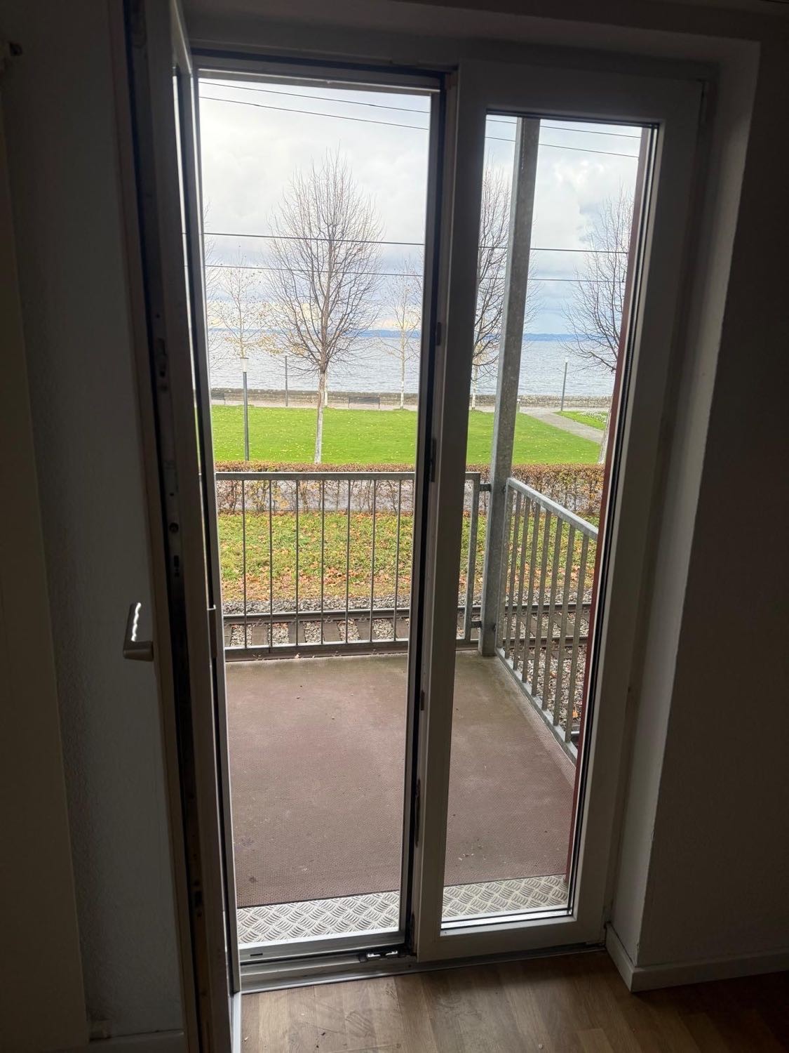 Helles Wohnzimmer: Mit Parkettboden und Glastüre zum Balkon, der einen schönen Blick auf und den See bietet