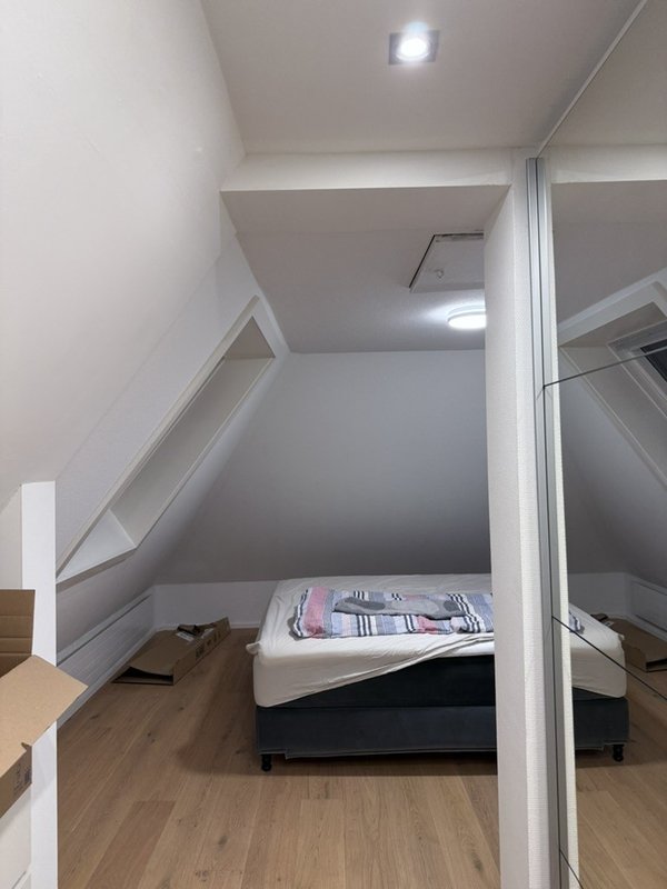 Separates Schlafzimmer: gemütliches Schlafzimmer mit schräger Holzdecke, weissen Wänden, direkter Zugang zur großartigen Ankleide mit viel Stauraum