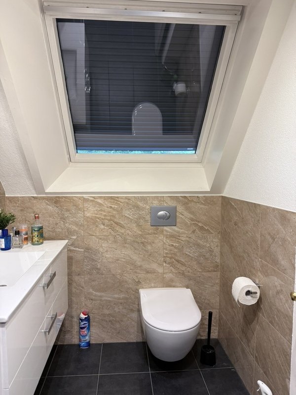 Modernes Badezimmer: Kompakt ausgestattet mit Dusche, WC, Waschbecken und Dachfenster