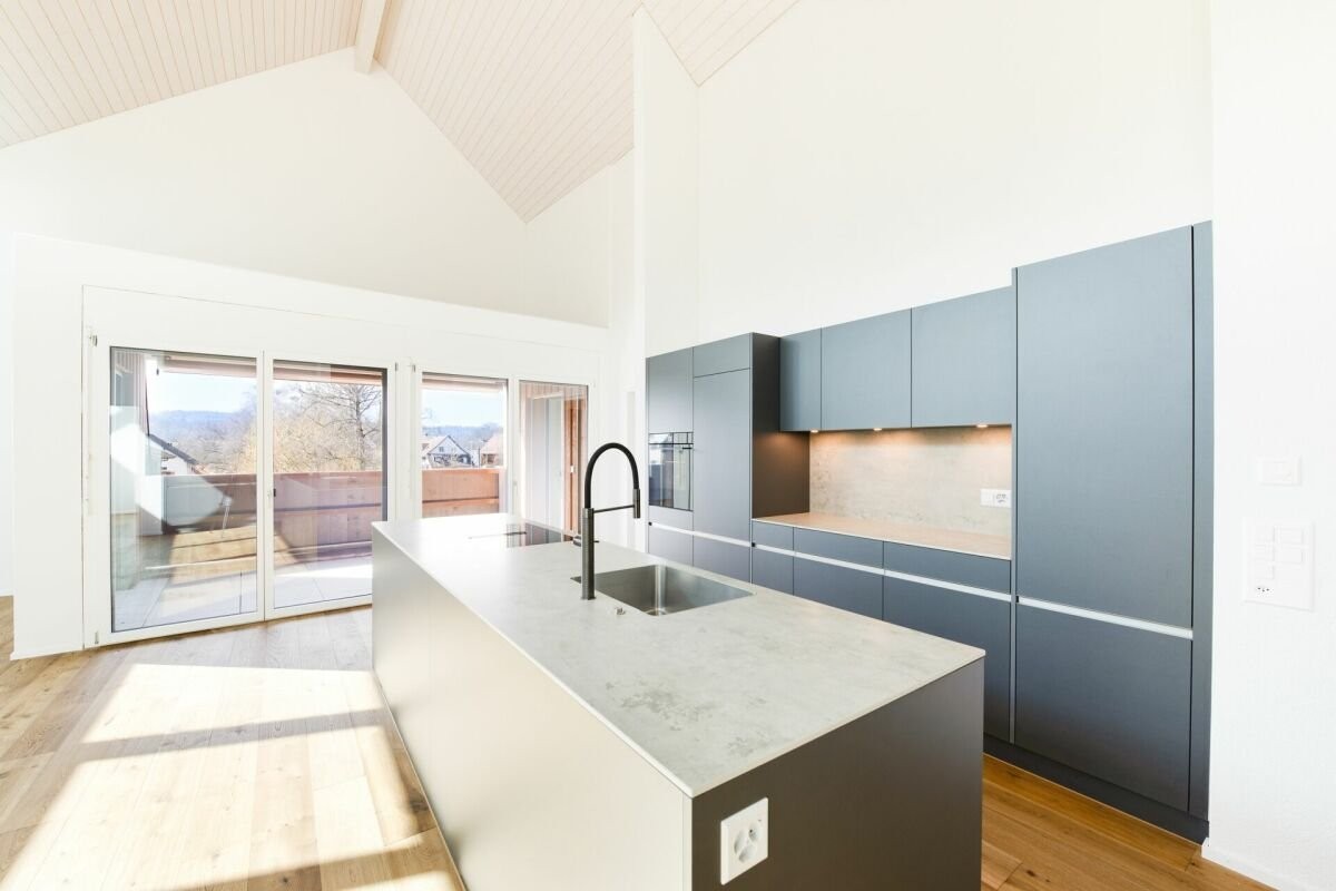 Die beiden Wohnungen im Obergeschoss verfügen über helle Räume und grosszügige Aussenflächen. Die Dachwohnungen begeistern mit überhöhten Räumen, die ein einzigartiges Wohngefühl schaffen. Viele Dachflächenfenster sorgen für eine helle, einladende Atmosphäre und unterstreichen den modernen Ausbau.