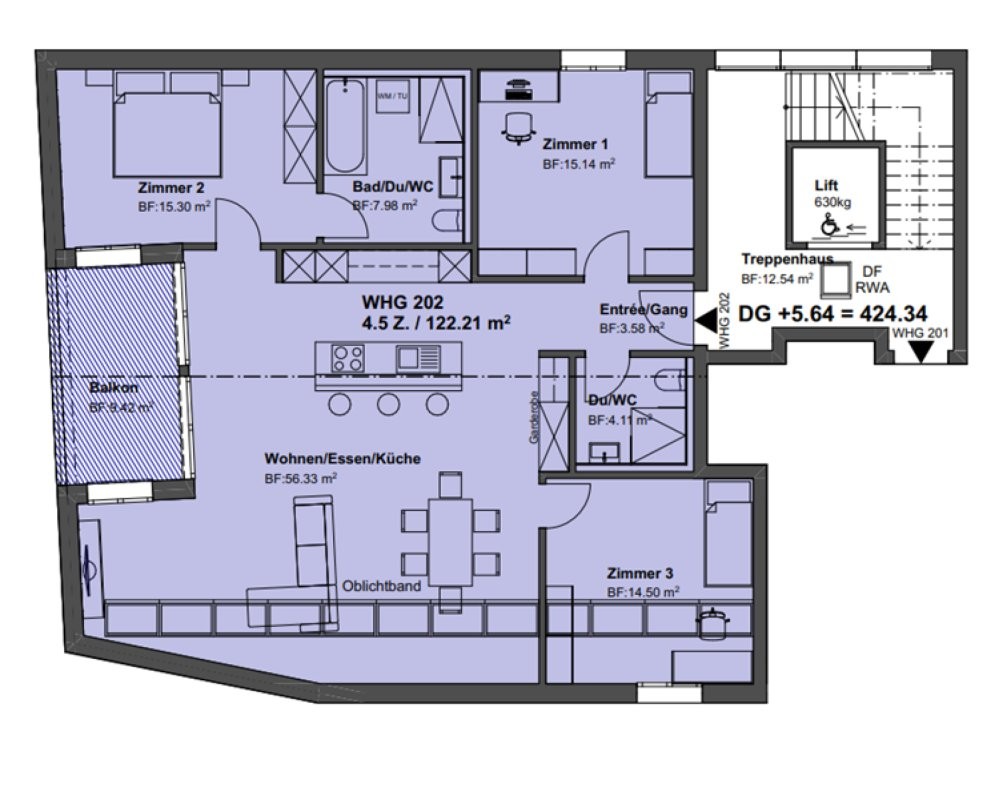 4.5 Zimmer Wohnfläche ca. 121.1 m², Balkon ca. 9.4m², Keller 8 m², CHF 2'950.- zuzüglich Nebenkosten für WG 202 Heizung, Wasser, allgemein Strom, Hauswartung, Verwaltung CHF 350.- exkl. TV, Radio